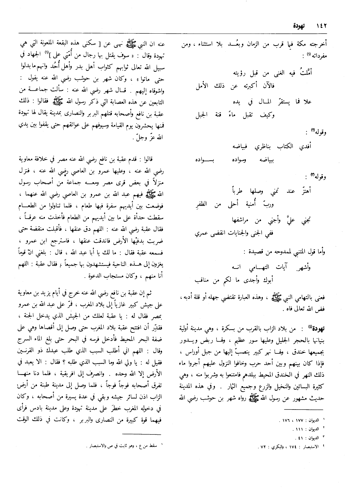 من بلاد الزاب بالقرب من بسكرة، وهي مدينة أولية بنيانها بالحجر الجليل وعليها سور عظيم، ولها ربض ويدور بجميعها خندق، ولها نهر كبير ينصب إليها من جبل أوراس، فإذا كان بينهم وبين أحد حرب وخافوا النزول عليهم أجروا ماء ذلك النهر في الخندق المحيط ببلدهم فامتنعوا به وشربوا منه، وهي كثيرة البساتين والنخيل والزرع وجميع الثمار. وفي هذه المدينة حديث مشهور عن رسول الله صلى الله عليه وسلم رواه شهر بن حوشب رضي الله عنه أن النبي صلى الله عليه وسلم نهى عن سكنى هذه البقعة الملعونة التي هي تهودة وقال: " سوف يقتل بها رجال من أمتي على (5) الجهاد في سبيل الله تعالى ثوابهم كثواب أهل بدر وأهل أحد وانهم مابدلوا حتى ماتوا "، وكان شهر بن حوشب رضي الله عنه يقول: واشوقاه إليهم. قال شهر رضي الله عنه: سألت جماعة من التابعين عن هذه العصابة التي ذكر رسول الله صلى الله عليه وسلم فقالوا: ذلك عقبة بن نافع وأصحابه قتلهم البربر والنصارى بمدينة يقال لها تهودة فمنها يحشرون يوم القيامة وسيوفهم على عواتقهم حتى يقفوا بين يدي الله عز وجل.