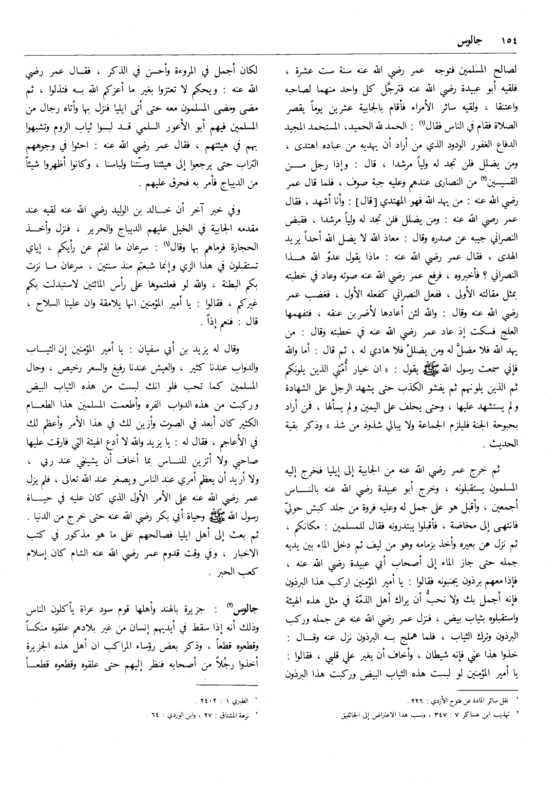 وفي خبر آخر أن خالد بن الوليد رضي الله عنه لقيه عند مقدمه الجابية في الخيل عليهم الديباج والحرير، فنزل وأخذ الحجارة فرماهم بها وقال (3) : سرعان ما لفتم عن رأيكم، إياي تستقبلون في هذا الزي وإنما شبعتم منذ سنتين، سرعان ما نزت بكم البطنة، والله لو فعلتموها على رأس المائتين لاستبدلت بكم غيركم، فقالوا: يا أمير المؤمنين إنها يلامقة وإن علينا السلاح، قال: فنعم إذاً.