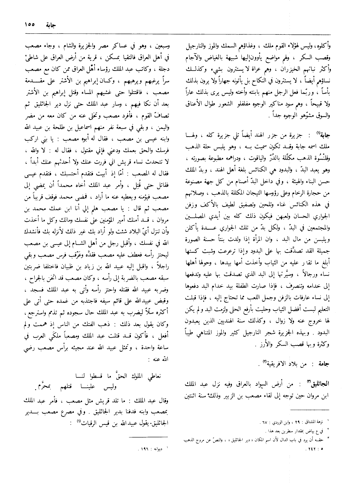 جزيرة من جزر الهند أيضاً تلي جزيرة كله، ولها ملك اسمه جابة وقد تكون سميت به، وهو يلبس حلة الذهب وقلنسوة الذهب مكللة بالدر والياقوت، ودراهمه مطبوعة بصورته، وهو يعبد البد، والبدود هي الكنائس بلغة أهل الهند، وبد الملك حسن البناء والهيئة، وفي داخل البد أصنام من كل جهة مصنوعة من حجارة الرخام وعلى رؤوسها التيجان المكللة بالذهب، وصلاتهم في هذه الكنائس غناء وتلحين وتصفيق لطيف بالأكف وزفن الجواري الحسان ولعبهن فيكون ذلك كله بين أيدي المصلين والمجتمعين في البد، ولكل بد من تلك الجواري عدة يأكلن ويلبسن من مال البد، وإن المرأة إذا ولدت بنتاً حسنة الصورة جميلة القد تصدقت بها على البدود وإذا ترعرعت وشبت كستها أبلغ ما تقدر عليه من الثياب وأخذت أمها بيدها، وحولها أهلها نساء ورجالاً، وسيرتها إلى البد الذي تصدقت بها عليه وتدفعها إلى خدامه وتنصرف، فإذا صارت الطفلة بيد خدام البد دفعوها إلى نساء عارفات بالزفن وجمل اللعب مما تحتاج إليه، فإذا قبلت التعليم لبست أفضل الثياب وحليت بأرفع الحلى ولزمت البد ولم يكن لها خروج عنه ولا زوال، وكذلك سنة الهنديين الذين يعبدون البدود. وبهذه الجزيرة شجر النارجيل كثير والموز المتناهي طيباً وكثرة وبها قصب السكر والأرز.