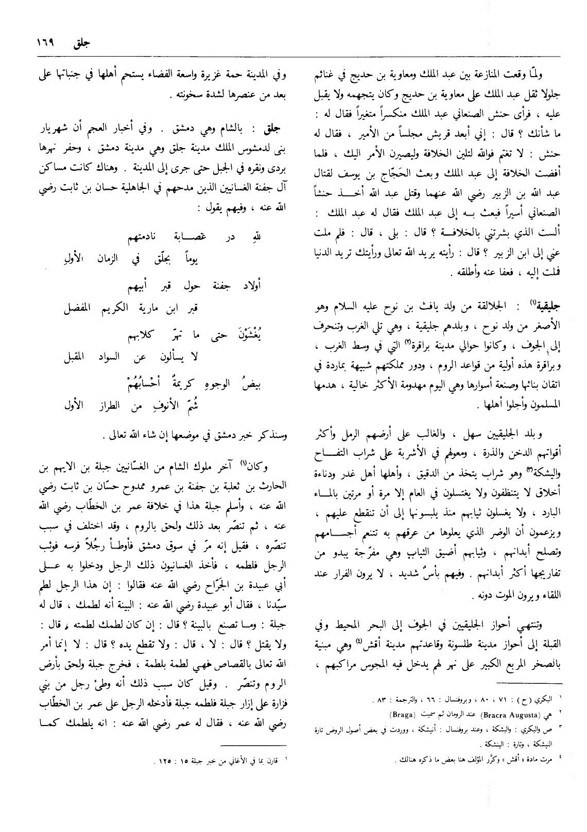 بالشام وهي دمشق. وفي أخبار العجم أن شهريار بنى لدمشوس الملك مدينة جلق وهي مدينة دمشق، وحفر نهرها بردى ونقره في الجبل حتى جرى إلى المدينة. وهناك كانت مساكن آل جفنة الغسانيين الذين مدحهم في الجاهلية حسان بن ثابت رضي الله عنه، وفيهم يقول: