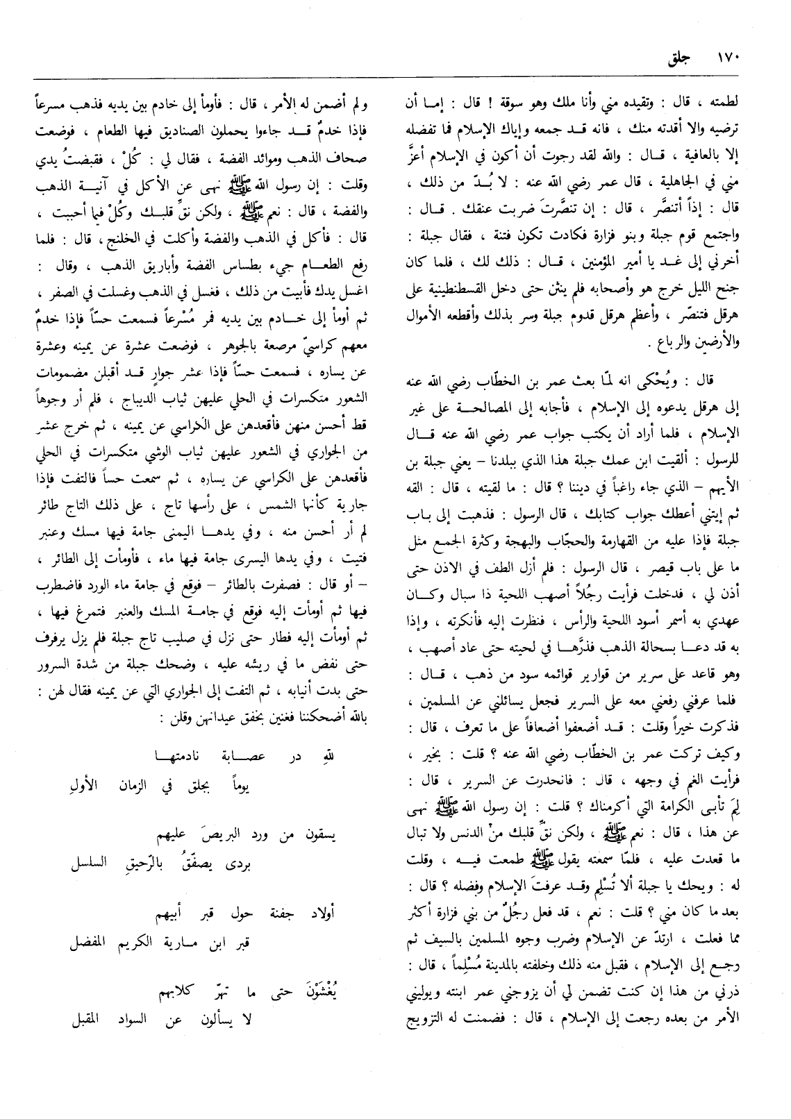 لطمته، قال: وتقيده مني وأنا ملك وهو سوقة! قال: إما أن ترضيه وإلا أقدته منك، فإنه قد جمعه وإياك الإسلام فما تفضله إلا بالعافية، قال: والله لقد رجوت أن أكون في الإسلام أعز مني في الجاهلية، قال عمر رضي الله عنه: لا بد من ذلك، قال: إذاً أتنصر، قال: إن تنصرت ضربت عنقك. قال: واجتمع قوم جبلة وبنو فزارة فكادت تكون فتنة، فقال جبلة: أخرني إلى غد يا أمير المؤمنين، قال: ذلك لك، فلما كان جنح الليل خرج هو وأصحابه فلم ينثن حتى دخل القسطنطينية على هرقل فتنصر، وأعظم هرقل قدوم جبلة وسر بذلك وأقطعه الأموال والأرضين والرباع.