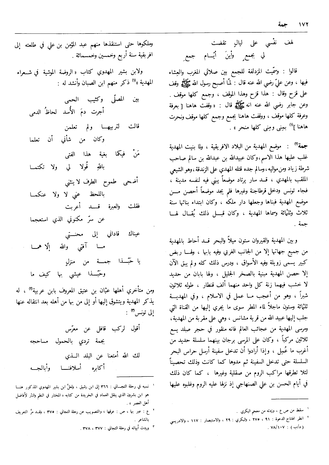 يا حبذا جمة من منزل ... وحبذا عيشي بها كيف ما ومن متأخري أهلها عثمان بن عتيق المعروف بابن عربية (4) ، له يذكر المهدية ويتشوق إليها أو إلى من بها من أهله بعد انتقاله عنها إلى تونس (5) :