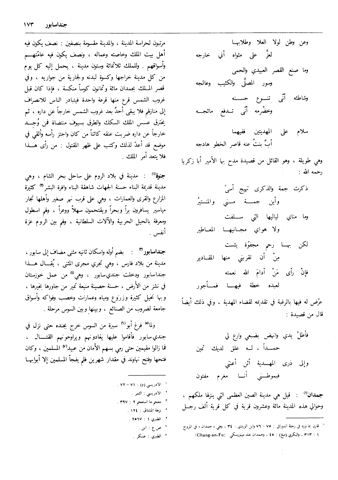 (1) قارن بما ورد في رحلة السيرافي: 75 - 76 وابن الوردي: 34، وهي ((حمدان)) في المروج 1: 313، والبكري (مخ) : 45، وخمدان عند مينورسكي (Chang - an - aaaaaafu) .