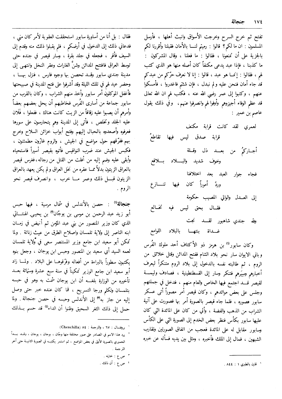 ولله جندي شاهبور لقد نجت ... غداة بنتها بالبلاد اللوامع وكان سابور (1) بن هرمز ذو الأكتاف أحد ملوك الفرس وباني الإيوان سار نحو بلاد الشام ففتح المدائن وقتل خلائق من الروم، ثم طالبته نفسه بالدخول إلى بلاد الروم متنكراً ليعرف أخبارهم وسيرهم فتنكر وسار إلى القسطنطينية، فصادف وليمة لقيصر قد اجتمع فيها الخاص والعام منهم، فدخل في جملتهم وجلس على بعض موائدهم، وكان قيصر أمر مصوراً أتى عسكر سابور فصوره، فلما جاء قيصر بالصورة أمر بها فصورت على آنية الشراب من الذهب والفضة، وأتي من كان على المائدة التي كان عليها سابور بكأس فنظر بعض الخدم إلى الصورة التي على الكأس وسابور مقابل له على المائدة فعجب من اتفاق الصورتين وتقارب الشبهين، فمال إلى الملك فأخبره، ومثل بين يديه فسأله عن خبره فقال: بل أنا من أساورة سابور استحققت العقوبة لأمر كان مني، فدعاني ذلك إلى الدخول في أرضكم، فلم يقبلوا ذلك منه وقدم إلى السيف فأقر، فجعله في جلد بقرة، وسار قيصر في جنده حتى توسط العراق فافتتح المدائن وشن الغارات وعقر النخل وانتهى إلى مدينة جندي سابور وقد تحصن بها وجوه فارس، فنزل بها، وحضر عيد لهم في تلك الليلة وقد أشرفوا على فتح المدينة في صبيحتها فأغفل الموكلون أمر سابور وأخذ منهم الشراب، وكان بالقرب من سابور جماعة من أسارى الفرس فخاطبهم أن يحل بعضهم بعضاً وأمرهم أن يصبوا عليه زقاقاً من الزيت كانت هناك، ففعلوا، فلان عليه الجلد وتخلص، فأتى إلى المدينة وهم يتحارسون على سورها فعرفوه وأصعدوه بالحبال إليهم وفتح أبواب خزائن السلاح وخرج بهم ففرقهم حول مواضع في الجيش، والروم غارون مطمئنون، فكبس الجيش عند ضرب النواقيس فأتوه بقيصر أسيراً فاستحياه وأبقى عليه وضم إليه من أفلت من القتل من رجاله، فغرس قيصر بالعراق الزيتون بدلاً مما عقره من نخل العراق ولم يكن يعهد بالعراق الزيتون قبل ذلك وعمر ما خرب، وانصرف قيصر نحو الروم.