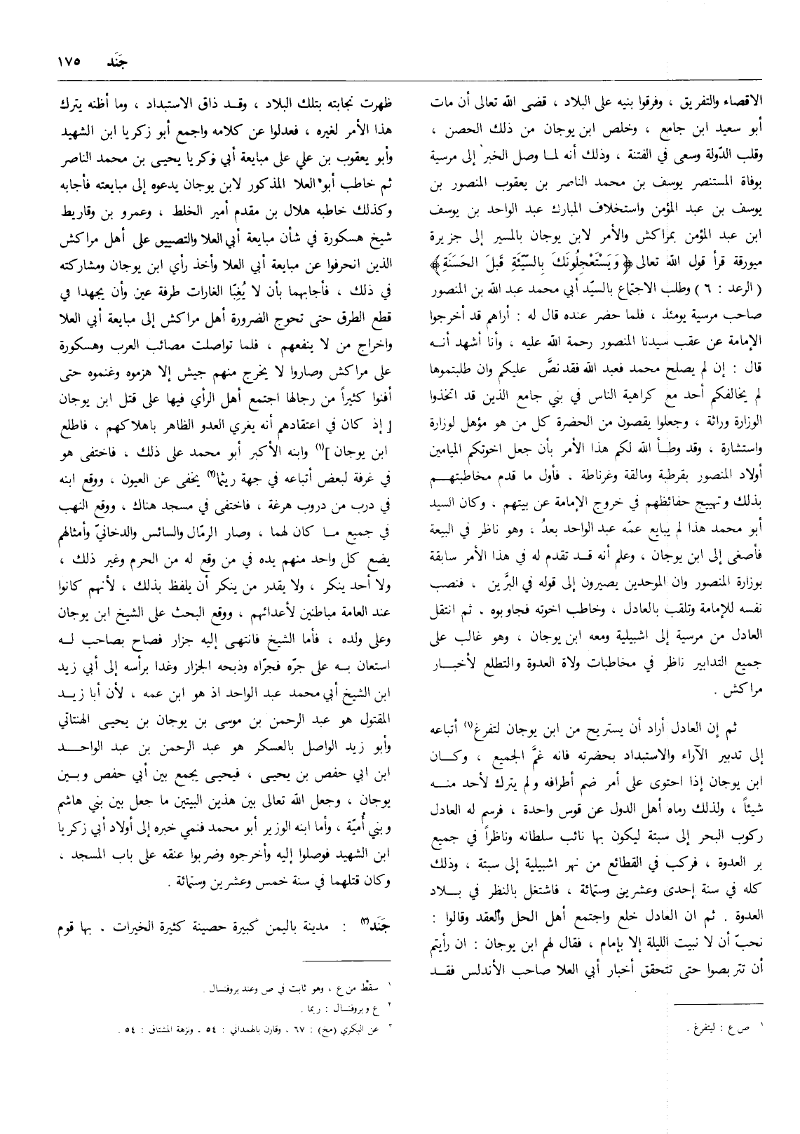 ثم إن العادل أراد أن يستريح من ابن يوجان لتفرغ (1) أتباعه إلى تدبير الآراء والاستبداد بحضرته فإنه غم الجميع وكان ابن يوجان إذا احتوى على أمر ضم أطرافه ولم يترك لأحد منه شيئاً، ولذلك رماه أهل الدول عن قوس واحدة، فرسم له العادل ركوب البحر إلى سبتة ليكون بها نائب سلطانه وناظراً في جميع بر العدوة، فركب في القطائع من نهر اشبيلية إلى سبتة؛ وذلك كله في سنة إحدى وعشرين وستمائة، فاشتغل بالنظر في بلاد العدوة. ثم إن العادل خلع واجتمع أهل الحل والعقد وقالوا: نحب أن لا نبيت الليلة إلا بإمام، فقال لهم ابن يوجان: إن رأيتم أن تتربصوا حتى تتحقق أخبار أبي العلا صاحب الأندلس فقد ظهرت نجابته بتلك البلاد، وقد ذاق الاستبداد، وما أظنه يترك هذا الأمر لغيره، فعدلوا عن كلامه وأجمع أبو زكريا ابن الشهيد وأبو يعقوب بن علي على مبايعة أبي زكريا يحيى بن محمد الناصر ثم خاطب أبو العلا المذكور لابن يوجان يدعوه إلى مبايعته فأجابه وكذلك خاطبه هلال بن مقدم أمير الخلط، وعمرو بن وقاريط شيخ هسكورة في شأن مبايعة أبي العلا والتضييق على أهل مراكش الذين انحرفوا عن مبايعة أبي العلا وأخذ رأي ابن يوجان ومشاركته في ذلك، فأجابهما بأن لا يغبا الغارات طرفة عين وأن يجهدا في قطع الطرق حتى تحوج الضرورة أهل مراكش إلى مبايعة أبي العلا وإخراج من لا ينفعهم، فلما تواصلت مصائب العرب وهسكورة على مراكش وصاروا لا يخرج منهم جيش إلا هزموه وغنموه حتى أفنوا كثيراً من رجالها اجتمع أهل الرأي فيها على قتل ابن يوجان إذ كان في اعتقادهم أنه يغري العدو الظاهر بإهلاكهم، فاطلع ابن يوجان (2) ، وابنه الأكبر أبو محمد على ذلك، فاختفى هو في غرفة لبعض أتباعه في جهة ريثما (3) يخفى عن العيون، ووقع ابنه في درب من دروب هرغة، فاختفى في مسجد هناك، ووقع النهب في جميع ما كان لهما، وصار الرمال والسائس والدخاني وأمثالهم يضع كل واحد منهم يده في من وقع له من الحرم وغير ذلك، ولا أحد ينكر، ولا يقدر من ينكر أن يلفظ بذلك، لأنهم كانوا عند العامة مباطنين لأعدائهم، ووقع البحث على الشيخ ابن يوجان وعلى ولده، فأما الشيخ فانتهى إليه جزار فصاح بصاحب له استعان به على جره فجراه وذبحه الجزار وغدا برأسه إلى أبي زيد ابن الشيخ أبي محمد عبد الواحد إذ هو ابن عمه، لأن أبا زيد المقتول هو عبد الرحمن بن موسى بن يوجان بن يحيى الهنتاتي وأبو زيد الواصل بالعسكر هو عبد الرحمن بن عبد الواحد بن أبي حفص بن يحيى، فيحيى يجمع بين أبي حفص وبين يوجان، وجعل الله تعالى بين هذين البيتين ما جعل بين بني هاشم وبني أمية؛ وأما ابنه الوزير أبو محمد فنمي خبره إلى أولاد أبي زكريا ابن الشهيد فوصلوا إليه وأخرجوه وضربوا عنقه على باب المسجد وكان قتلهما في سنة خمس وعشرين وستمائة.