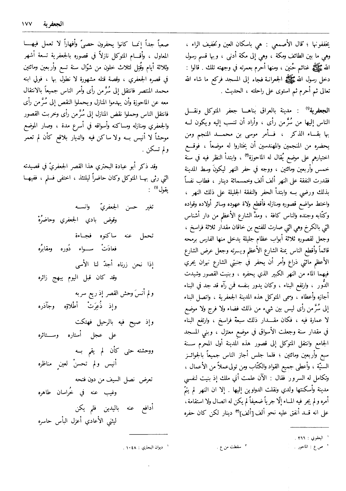 مدينة بالعراق بناها جعفر المتوكل ونقل الناس إليها من سر من رأى، وأراد أن تنسب إليه ويكون له بها بقاء الذكر، فأمر موسى بن محمد المنجم ومن يحضره من المنجمين والمهندسين أن يختاروا له موضعاً، فوقع اختيارهم على موضع يقال له الماحوزة (2) ، وابتدأ النظر فيه في سنة خمس وأربعين ومائتين، ووجه في حفر النهر ليكون وسط المدينة فقدرت النفقة على النهر ألف ألف وخمسمائة دينار، فطاب نفساً بذلك ورضي به وابتدأ الحفر والنفقة الجليلة على ذلك النهر، واختط مواضع قصوره ومنازله فأقطع ولاة عهوده وسائر أولاده وقواده وكتابه وجنده والناس كافة، ومد الشارع الأعظم من دار أشناس التي بالكرخ وهي التي صارت للفتح بن خاقان مقدار ثلاثة فراسخ، وجعل لقصوره ثلاثة أبواب عظام جليلة يدخل منها الفارس برمحه قائماً وأقطع الناس يمنة الشارع الأعظم ويسرته وجعل عرض الشارع الأعظم مائتي ذراع وأمر أن يحفر في جنبتي الشارع نهران يجري فيهما الماء من النهر الكبير الذي يحفره، وبنيت القصور وشيدت الدور، وارتفع البناء، وكان يدور بنفسه فمن رآه قد جد في البناء أجازه وأعطاه، وسمى المتوكل هذه المدينة الجعفرية، واتصل البناء إلى سر من رأى ليس بين شيء من ذلك فضاء ولا فرج ولا موضع لا عمارة فيه، فكان مقدار ذلك سبعة فراسخ، وارتفع البناء في مقدار سنة وجعلت الأسواق في موضع معتزل، وبني المسجد الجامع وانتقل المتوكل إلى قصور هذه المدينة أول المحرم سنة سبع وأربعين ومائتين، فلما جلس أجاز الناس جميعاً بالجوائز السنية، وأعطى جميع القواد والكتاب ومن تولى عملاً من الأعمال، وتكامل له السرور فقال: الآن علمت أني ملك إذ بنيت لنفسي مدينة وأسكنتها ولدي ونقلت الدواوين إليها. إلا أن النهر لم يتم أمره ولم يجر فيه الماء إلا جرياً ضعيفاً لم يكن له اتصال ولا استقامة، على أنه قد أنفق عليه نحو ألف ألف (3) دينار لكن كان حفره صعباً جداً إنما كانوا يحفرون حصى وأفهاراً لا تعمل فيها المعاول، وأقام المتوكل نازلاً في قصوره بالجعفرية تسعة أشهر وثلاثة أيام وقتل لثلاث خلون من شوال سنة تسع وأربعين ومائتين في قصره الجعفري، وقصة قتله مشهورة لا نطول بها، فولي ابنه محمد المنتصر فانتقل إلى سر من رأى وأمر الناس جميعاً بالانتقال معه عن الماحوزة وأن يهدموا المنازل ويحملوا النقض إلى سر من رأى فانتقل الناس وحملوا نقض المنازل إلى سر من رأى وخربت القصور والجعفري ومنازله ومساكنه وأسواقه في أسرع مدة، وصار الموضع موحشاً لا أنيس به ولا ساكن فيه والديار بلاقع كأن لم تعمر ولم تسكن.