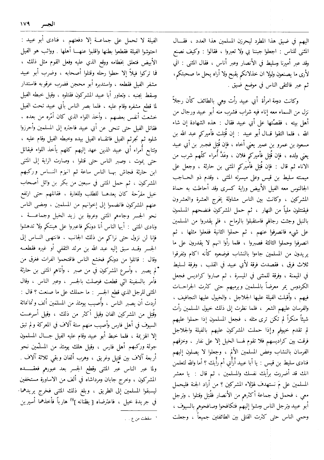 إليهم في ضيق هذا المطرد ليحرزن المسلمين هذا العدد، فقال المثنى للناس: اجعلوا جبننا بي ولا تعبروا، فقالوا: وكيف نصنع وقد عبر أميرنا وسليط في الأنصار وعبر أناس؛ فقال المثنى: إني لأرى ما يصنعون ولولا أن خذلانكم يقبح ولا أراه يحل ما صحبتكم، ثم عبر فالتقى الناس في موضع ضيق.