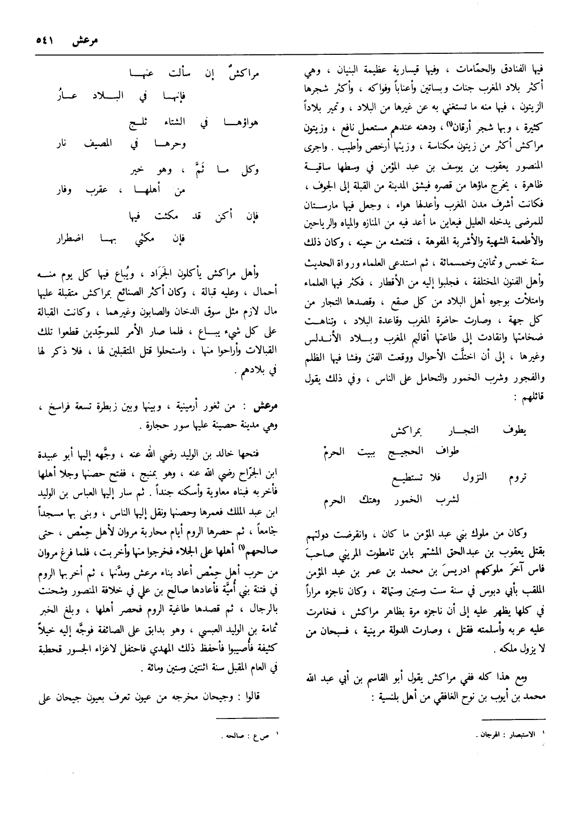 فإن أكن قد مكثت فيها ... فإن مكثي بها اضطرار وأهل مراكش يأكلون الجراد، ويباع فيها كل يوم منه أحمال، وعليه قبالة، وكان أكثر الصنائع بمراكش متقبلة عليها مال لازم مثل سوق الدخان والصابون وغيرهما، وكانت القبالة على كل شيء يباع، فلما صار الأمر للموحدين قطعوا تلك القبالات وأراحوا منها، واستحلوا قتل المتقبلين لها، فلا ذكر لها في بلادهم.