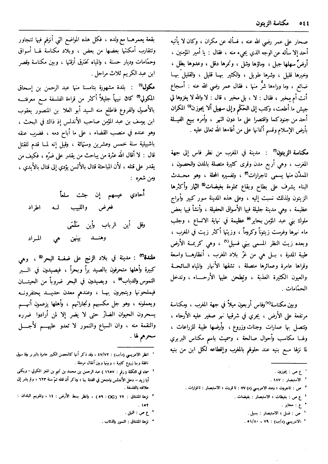 وبين مكناسة (7) وفاس أربعون ميلاً في جهة المغرب، ومكناسة مرتفعة على الأرض، يجري في شرقيها نهر صغير عليه الأرحاء، وتتصل بها عمارات وجنات وزروع، وأرضها طيبة للزراعات، ولها مكاسب وأحوال صالحة، وسميت باسم مكناس البربري لما نزلها مع بنيه عند حلولهم بالمغرب وإقطاعه لكل ابن من بنيه بقعة يعمرها مع ولده، فكل هذه المواضع التي أنزلهم فيها تتجاور وتتقارب أمكنتها بعضها من بعض، وبلاد مكناسة لها أسواق وحمامات وديار حسنة، والمياه تخترق أزقتها، وبين مكناسة وقصر ابن عبد الكريم ثلاث مراحل.