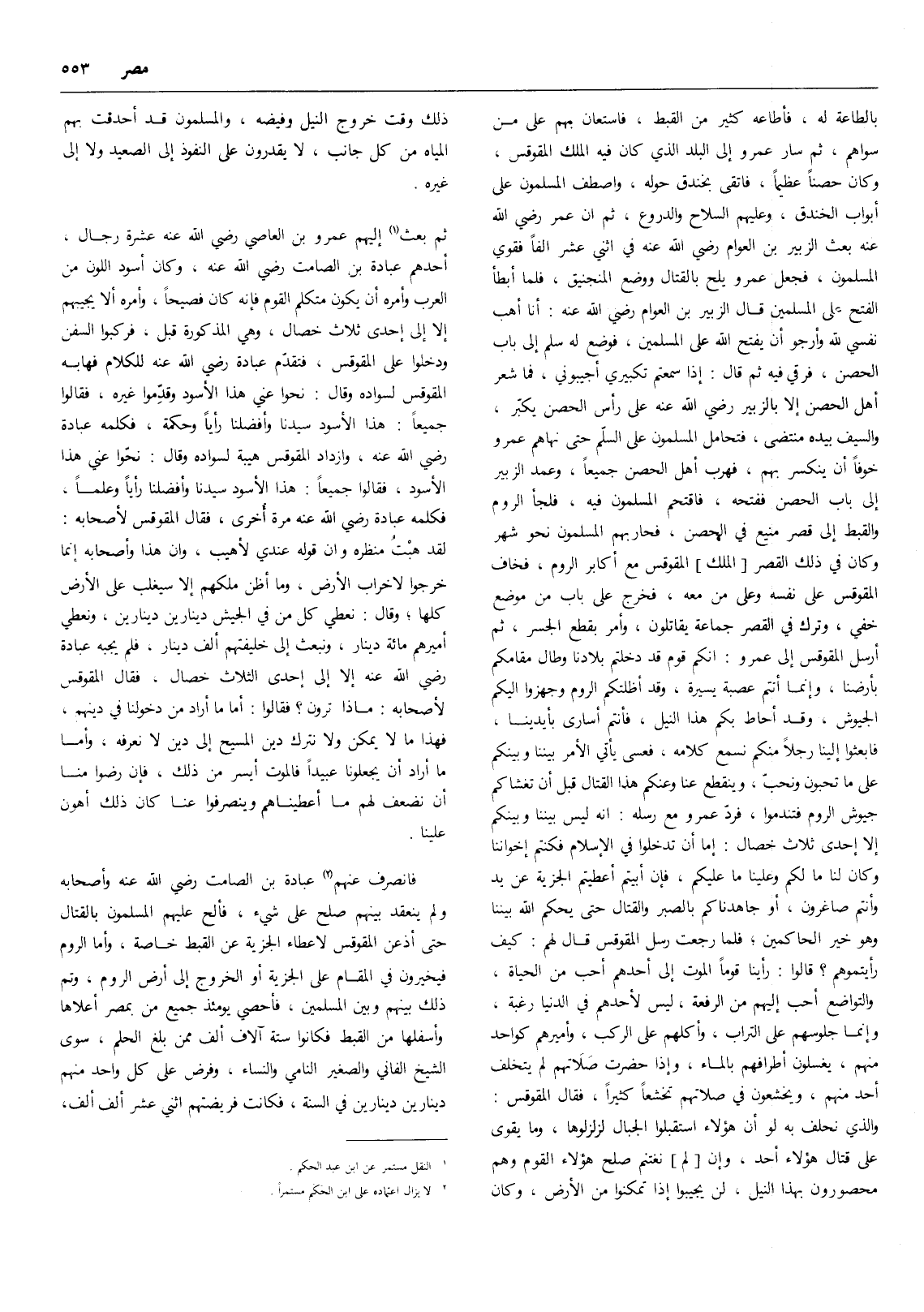 فانصرف عنهم (2) عبادة بن الصامت رضي الله عنه وأصحابه ولم ينعقد بينهم صلح على شيء، فألح عليهم المسلمون بالقتال حتى أذعن المقوقس لإعطاء الجزية عن القبط خاصة، وأما الروم فيخيرون في المقام على الجزية أو الخروج إلى أرض الروم، وتم ذلك بينهم وبين المسلمين، فأحصي يومئذ جميع من بمصر أعلاها وأسفلها من القبط فكانوا ستة آلاف ألف ممن بلغ الحلم، سوى الشيخ الفاني والصغير النامي والنساء، وفرض على كل واحد منهم دينارين دينارين في السنة، فكانت فريضتهم اثني عشر ألف ألف،