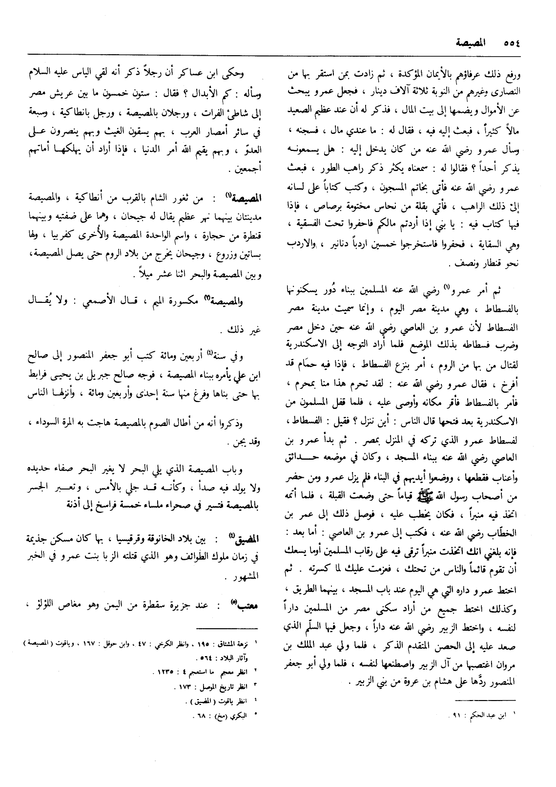 ثم أمر عمرو (1) رضي الله عنه المسلمين ببناء دور يسكنونها بالفسطاط، وهي مدينة مصر اليوم، وإنما سميت مدينة مصر الفسطاط لأن عمرو بن العاصي رضي الله عنه حين دخل مصر وضرب فسطاطه بذلك الموضع فلما أراد التوجه إلى الإسكندرية لقتال من بها من الروم، أمر بنزع الفسطاط، فإذا فيه حمام قد أفرخ، فقال عمرو رضي الله عنه: لقد تحرم هذا منا بمحرم، فأمر بالفسطاط فأقر مكانه وأوصى عليه، فلما قفل المسلمون من الإسكندرية بعد فتحها قال الناس: أين ننزل؟ فقيل: الفسطاط، لفسطاط عمرو الذي تركه في المنزل بمصر. ثم بدأ عمرو بن العاصي رضي الله عنه ببناء المسجد، وكان في موضعه حدائق وأعناب فقطعها، ووضعوا أيديهم في البناء فلم يزل عمرو ومن حضر من أصحاب رسول الله صلى الله عليه وسلم قياماً حتى وضعت القبلة، فلما أتمه اتخذ فيه منبراً، فكان يخطب عليه، فوصل ذلك إلى عمر بن الخطاب رضي الله عنه، فكتب إلى عمرو بن العاصي: أما بعد: فإنه بلغني أنك اتخذت منبراً ترقى فيه على رقاب المسلمين أوما يسعك أن تقوم قائماً والناس من تحتك، فعزمت عليك لما كسرته. ثم اختط عمرو داره التي هي اليوم عند باب المسجد، بينهما الطريق، وكذلك اختط جميع من أراد سكنى مصر من المسلمين داراً لنفسه، واختط الزبير رضي الله عنه داراً، وجعل فيها السلم الذي صعد عليه إلى الحصن المتقدم الذكر، فلما ولي عبد الملك بن مروان اغتصبها من آل الزبير واصطنعها لنفسه، فلما ولي أبو جعفر المنصور ردها على هشام بن عروة من بني الزبير.