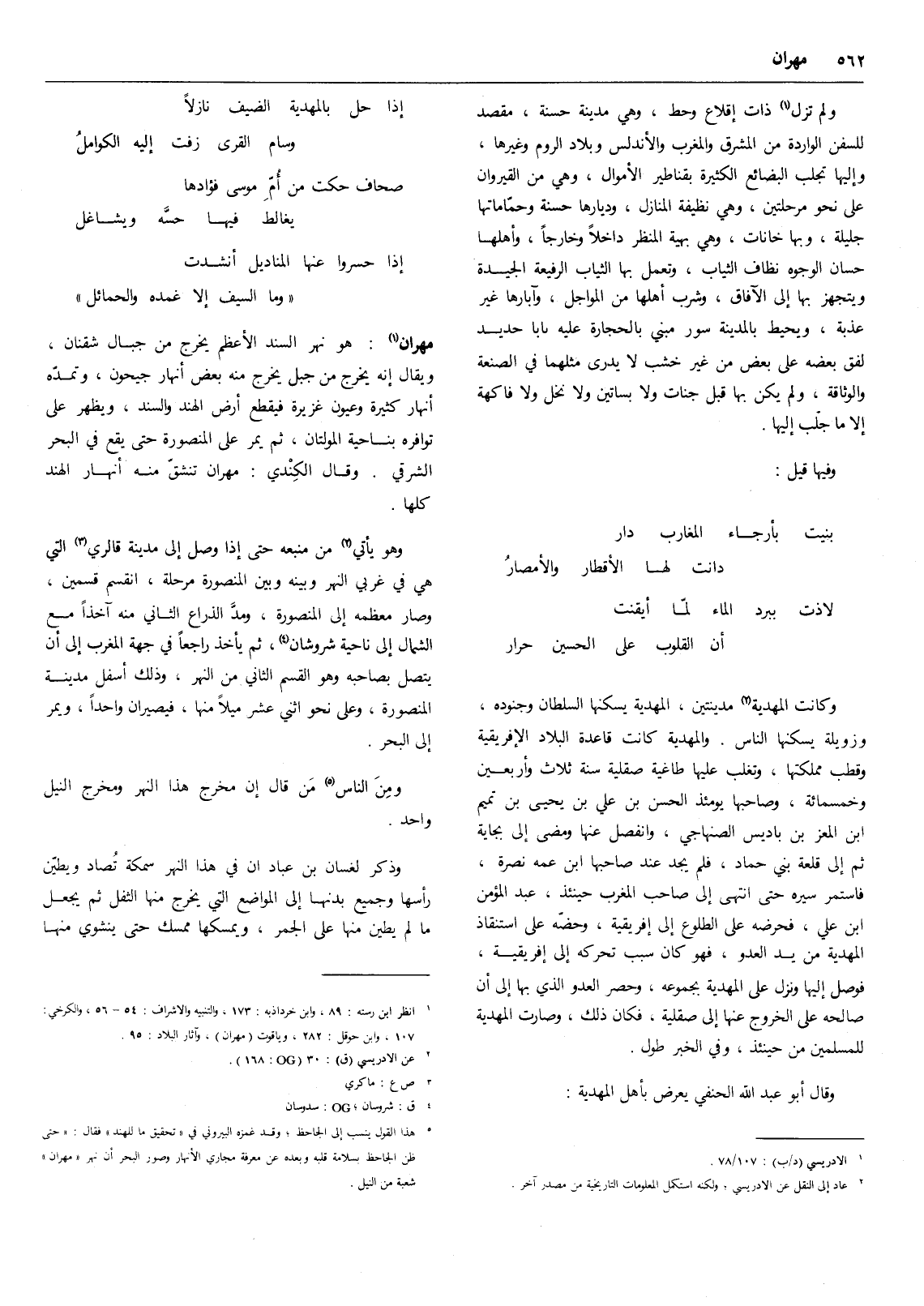 (7) هذا القول ينسب غلى الجاحظ؛ وقد غمزه البيروني في ((تحقيق ما للهند)) فقال: ((حتى ظن الجاحظ بسلامة قلبه وبعده عن معرفة مجاري الأنهار وصور البحر أن نهر ((مهران)) شعبة من النيل.