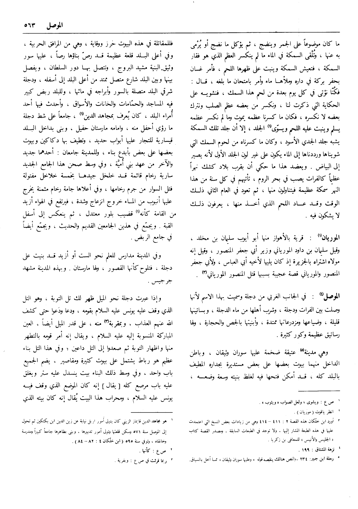 وإذا عبرت دجلة نحو الميل ظهر لك تل التوبة، وهو التل الذي وقف عليه يونس عليه السلام بقومه، ودعا ودعوا حتى كشف الله عنهم العذاب، وبمقربة منه (8) ، على قدر الميل أيضاً، العين المباركة المنسوبة إليه عليه السلام ويقال إنه أمر قومه بالتطهر منها وإظهار التوبة ثم صعدوا إلى التل داعين، وفي هذا التل بناء عظيم هو رباط يشتمل على بيوت كثيرة ومقاصير، يضم الجميع باب واحد، وفي وسط ذلك البناء بيت ينسدل عليه ستر ويغلق عليه باب مرصع كله يقال إنه كان الموضع الذي وقف فيه يونس عليه السلام، ومحراب هذا البيت يقال إنه كان بيته الذي
