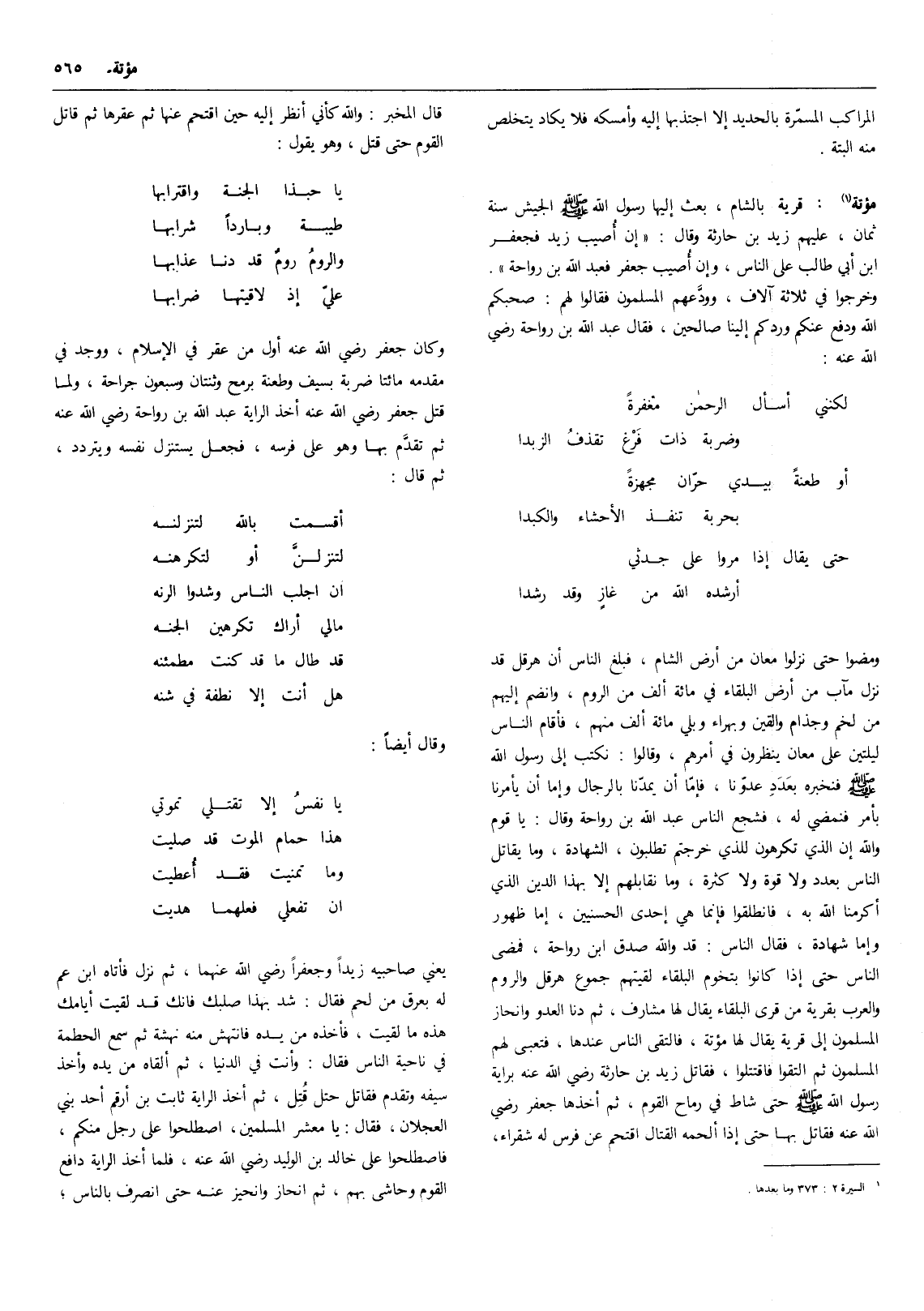 حتى يقال إذا مروا على جدثي ... أرشده الله من غاز وقد رشدا ومضوا حتى نزلوا معان من أرض الشام، فبلغ الناس أن هرقل قد نزل مآب من أرض البلقاء في مائة ألف من الروم، وانضم إليهم من لخم وجذام والقين وبهراء وبلي مائة ألف منهم، فأقام الناس ليلتين على معان ينظرون في أمرهم، وقالوا: نكتب إلى رسول الله صلى الله عليه وسلم فنخبره بعدد عدونا، فإما أن يمدنا بالرجال وإما أن يأمرنا بأمر فنمضي له، فشجع الناس عبد الله بن رواحة وقال: يا قوم والله إن الذي تكرهون للذي خرجتم تطلبون، الشهادة، وما يقاتل الناس بعدد ولا قوة ولا كثرة، وما نقابلهم إلا بهذا الدين الذي أكرمنا الله به، فانطلقوا فإنما هي إحدى الحسنيين، إما ظهور وإما شهادة، فقال الناس: قد والله صدق ابن رواحة، فمضى الناس حتى إذا كانوا بتخوم البلقاء لقيتهم جموع هرقل والروم والعرب بقرية من قرى البلقاء يقال لها مشارف، ثم دنا العدو وانحاز المسلمون إلى قرية يقال لها مؤتة، فالتقى الناس عندها، فتعبى لهم المسلمون ثم التقوا فاقتتلوا، فقاتل زيد بن حارثة رضي الله عنه براية رسول الله صلى الله عليه وسلم حتى شاط في رماح القوم، ثم أخذها جعفر رضي الله عنه فقاتل بها حتى إذا ألحمه القتال اقتحم عن فرس له شقراء، قال المخبر: والله كأني أنظر إليه حين اقتحم عنها ثم عقرها ثم قاتل القوم حتى قتل، وهو يقول: