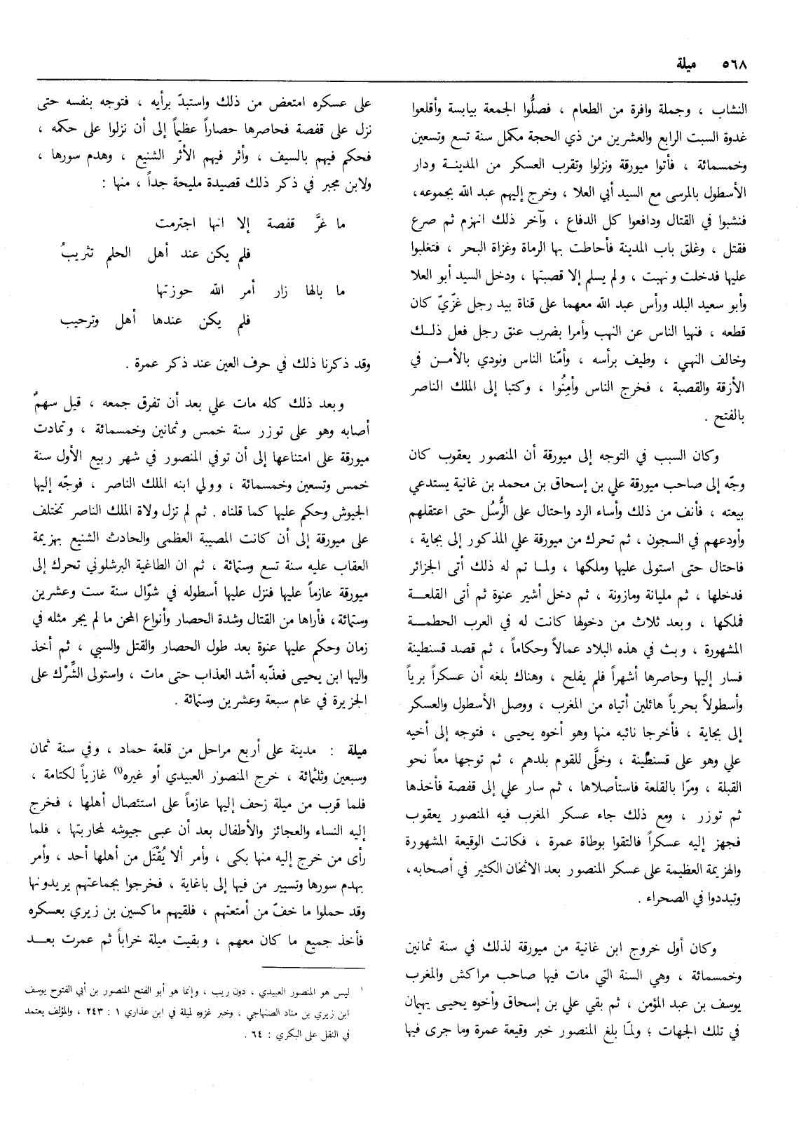 (1) ليس هو المنصور العبيدي، دون ريب، وإنما هو أبو الفتح المنصور بن أبي الفتوح يوسف ابن زيري بن مناد الصنهاجي، وخبر غزوه لميلة في ابن عذري 1: 243، والمؤلف يعتمد في النقل على البكري: 64.