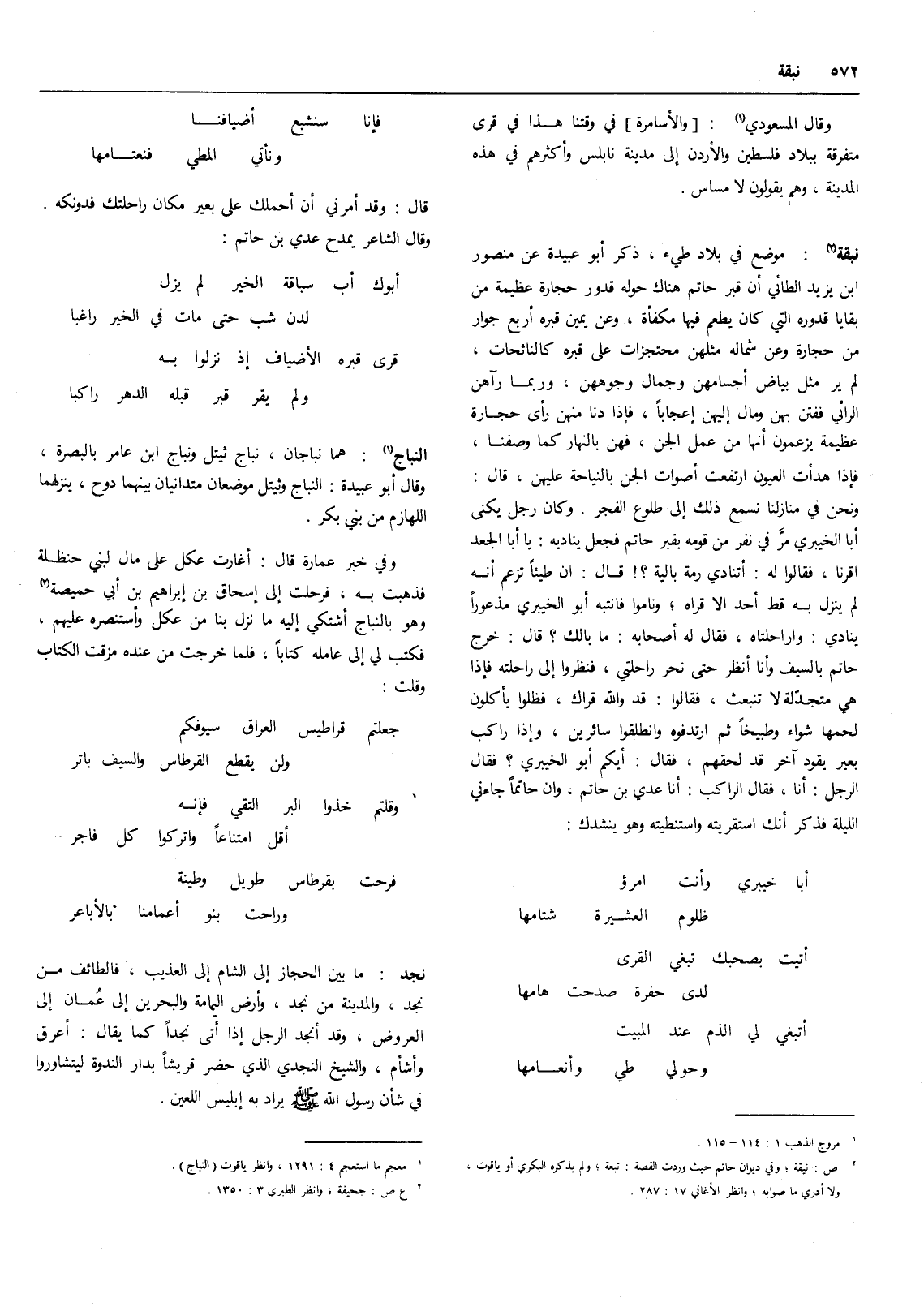 (2) ص: نيقة؛ وفي ديوان حاتم حيث وردت القصة: تبعة؛ ولم يذكره البكري أو ياقوت، ولا أدري ما صوابه؛ وانظر الأغاني 17: 287.