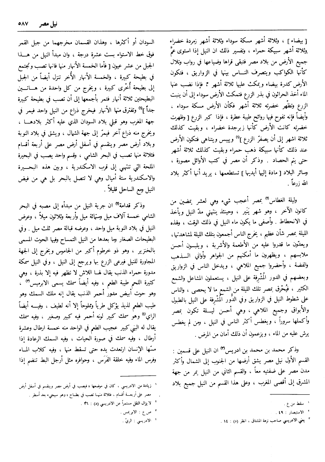 (4) زيادة من الإدريسي، كان في موضعها ((فيصيب في أرض مصر وينقسم في أسفل أرض مصر على أربعة أقسام، فثلاثة منها تصب في بطاح)) وهو سيجيء بعد أسطر.