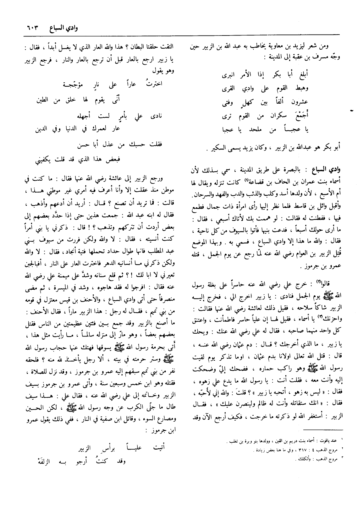 قالوا (2) : خرج علي رضي الله عنه حاسراً على بغلة رسول الله يوم الجمل فنادى: يا زبير اخرج إلي، فخرج إليه الزبير شاكاً سلاحه، فقيل ذلك لعائشة رضي الله عنها فقالت: واحزنك (3) يا أسماء، فقيل لها إن علياً حاسر فاطمأنت، واعتنق كل واحد منهما صاحبه، فقال له علي رضي الله عنك: ويحك يا زبير، ما الذي أخرجك؟ قال: دم عثمان رضي الله عنه، قال: قتل الله تعالى أولانا بدم عثمان، أوما تذكر يوم لقيت رسول الله صلى الله عليه وسلم وهو راكب حماره، فضحك إلي وضحكت إليه وأنت معه، فقلت أنت: يا رسول الله ما يدع علي زهوه، فقال: " ليس به زهو، أتحبه يا زبير "؟ قلت: والله إني لأحبه، فقال: " إنك ستقاتله وأنت له ظالم ولينصرن عليك "، فقال الزبير: أستغفر الله لو ذكرته ما خرجت، فكيف أرجع الآن وقد التقت حلقتا البطان؟ هذا والله العار الذي لا يغسل أبداً، فقال: يا زبير ارجع بالعار قبل أن ترجع بالعار والنار، فرجع الزبير وهو يقول:
