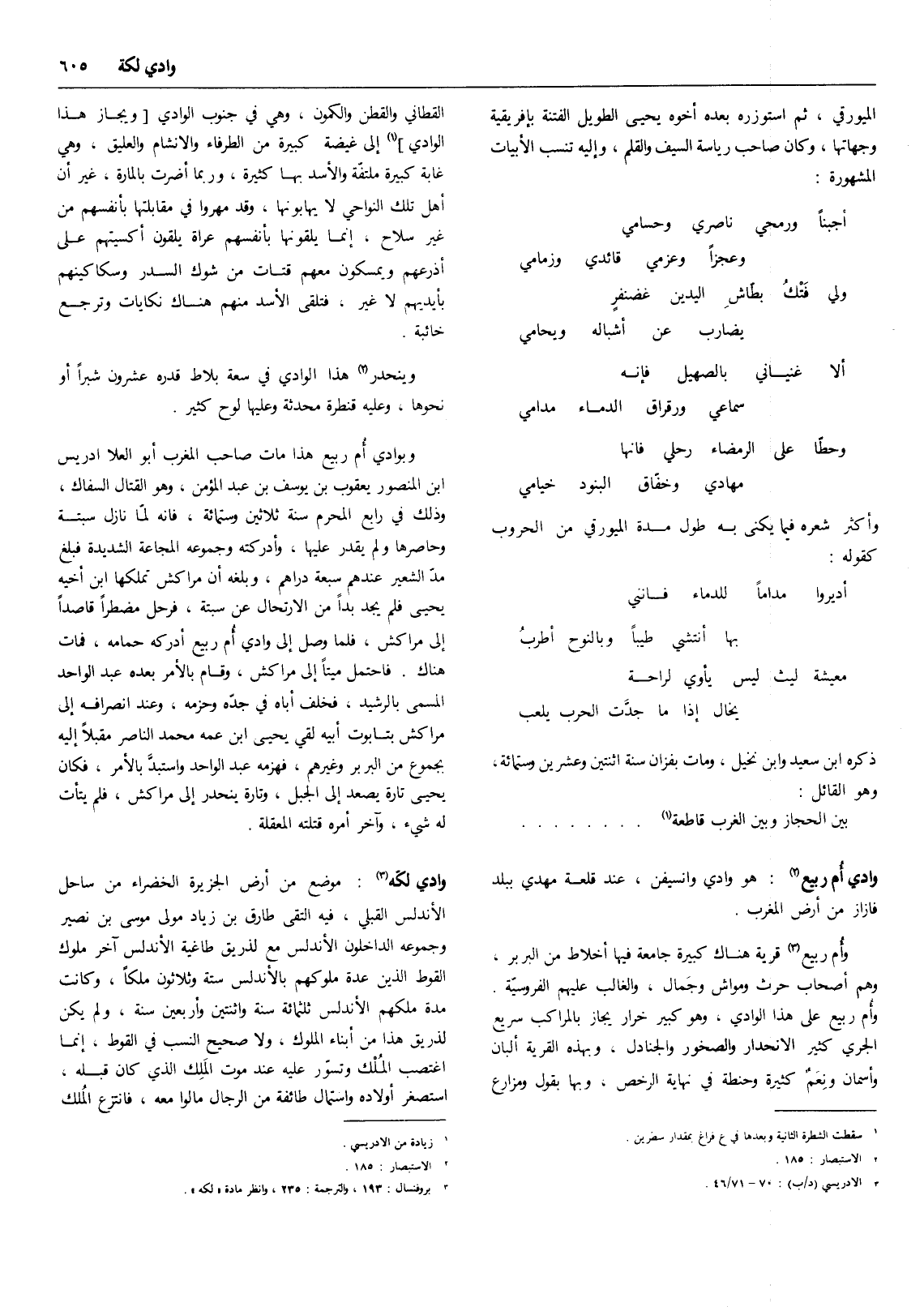 وأم ربيع (3) قرية هناك كبيرة جامعة فيها أخلاط من البربر وهم أصحاب حرث ومواش وجمال، والغالب عليهم الفروسية. وأم ربيع على هذا الوادي وهو كبير خرار يجاز بالمراكب سريع الجري كثير الانحدار والصخور والجنادل وبهذه القرية ألبان وأسمان ونعم كثيرة وحنطة في نهاية الرخص وبها بقول ومزارع القطاني والقطن والكمون، وهي في جنوب الوادي ويجاز هذا الوادي (4) ، إلى غيضة كبيرة من الطرفاء والانشام والعليق، وهي غابة كبيرة ملتفة والأسد بها كثيرة، وربما أضرت بالمارة، غير أن أهل تلك النواحي لا يهابونها، وقد مهروا في مقابلتها بأنفسهم من غير سلاح، إنما يلقونها بأنفسهم عراة يلقون أكسيتهم على أذرعهم ويمسكون معهما قتات من شوك السدر وسكاكينهم بأيديهم لا غير فتلقى الأسد منهم هناك نكايات وترجع خائبة.