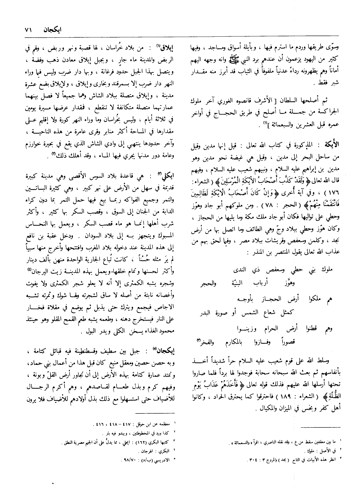 المذكورة في كتاب الله تعالى: قيل إنها مدين وقيل من ساحل البحر إلى مدين، وقيل هي غيضة نحو مدين وهو مدين بن إبراهيم عليه السلام، ونبيهم شعيب عليه السلام، وفيهم قال الله تعالى " ولقد كذب أصحاب الأيكة المرسلين "، وفي آية أخرى " وإن كان أصحاب الأيكة لظالمين فانتقمنا منهم " ومن ملوكهم أبو جاد وهوز وحطي على تواليها فكان أبو جاد ملك مكة وما يليها من الحجاز، وكان هوز وحطي ببلاد وج وهي الطائف وما اتصل بها من أرض نجد، وكلمن وسعفص وقريشات ببلاد مصر، وفيما لحق بهم من عذاب الله تعالى يقول المنتصر بن المنذر: