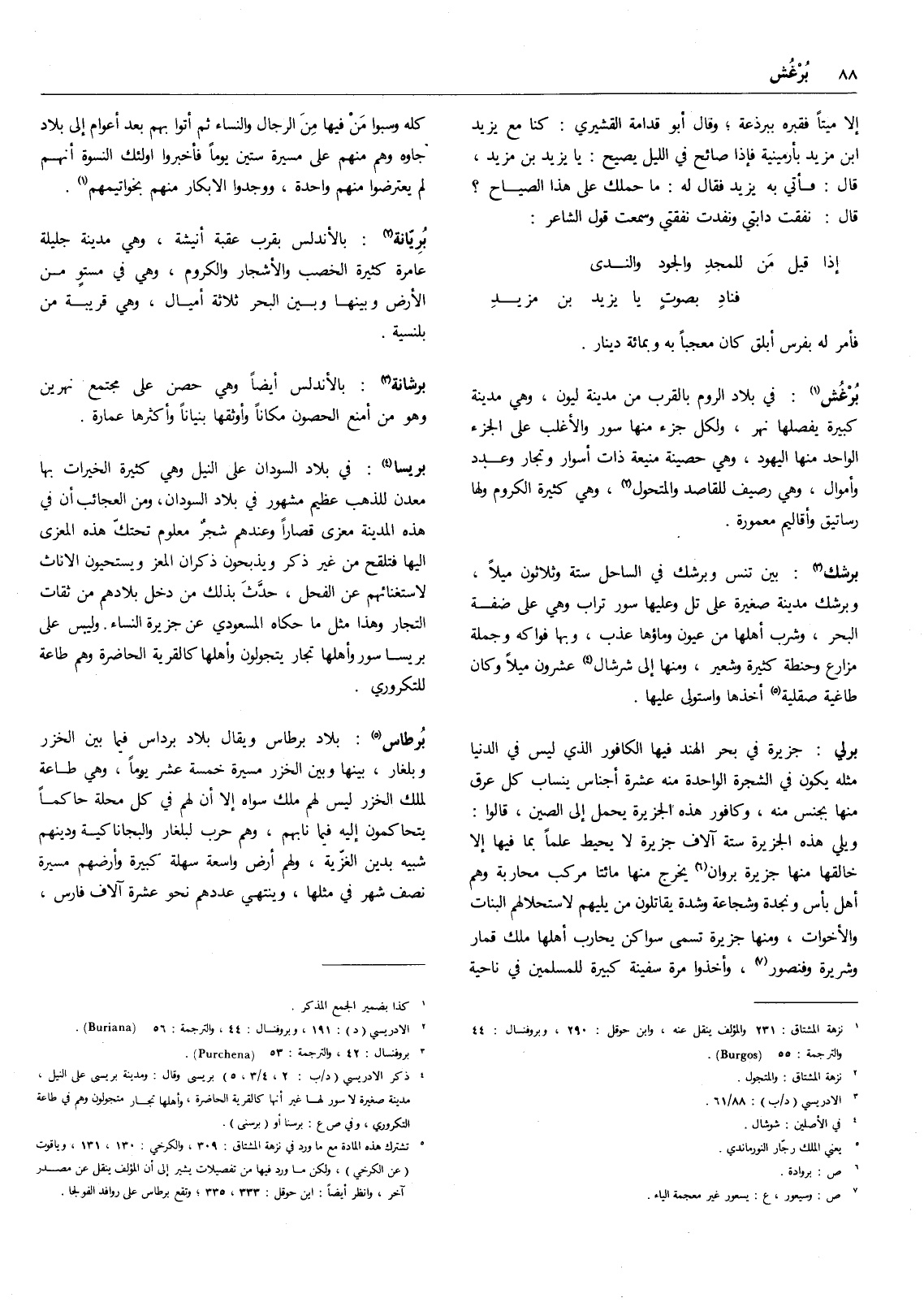 (12) تشترك هذه المادة مع ما ورد في نزهة المشتاق: 309، والكرخي: 130، 131، وياقوت (عن الكرخي) ، ولكن ما ورد فيها من تفصيلات يشير إلى أن المؤلف ينقل عن مصدر آخر، والنظر أيضاً: ابن حوقل: 333، 335، وتقع برطاس على روافد الفولجا.