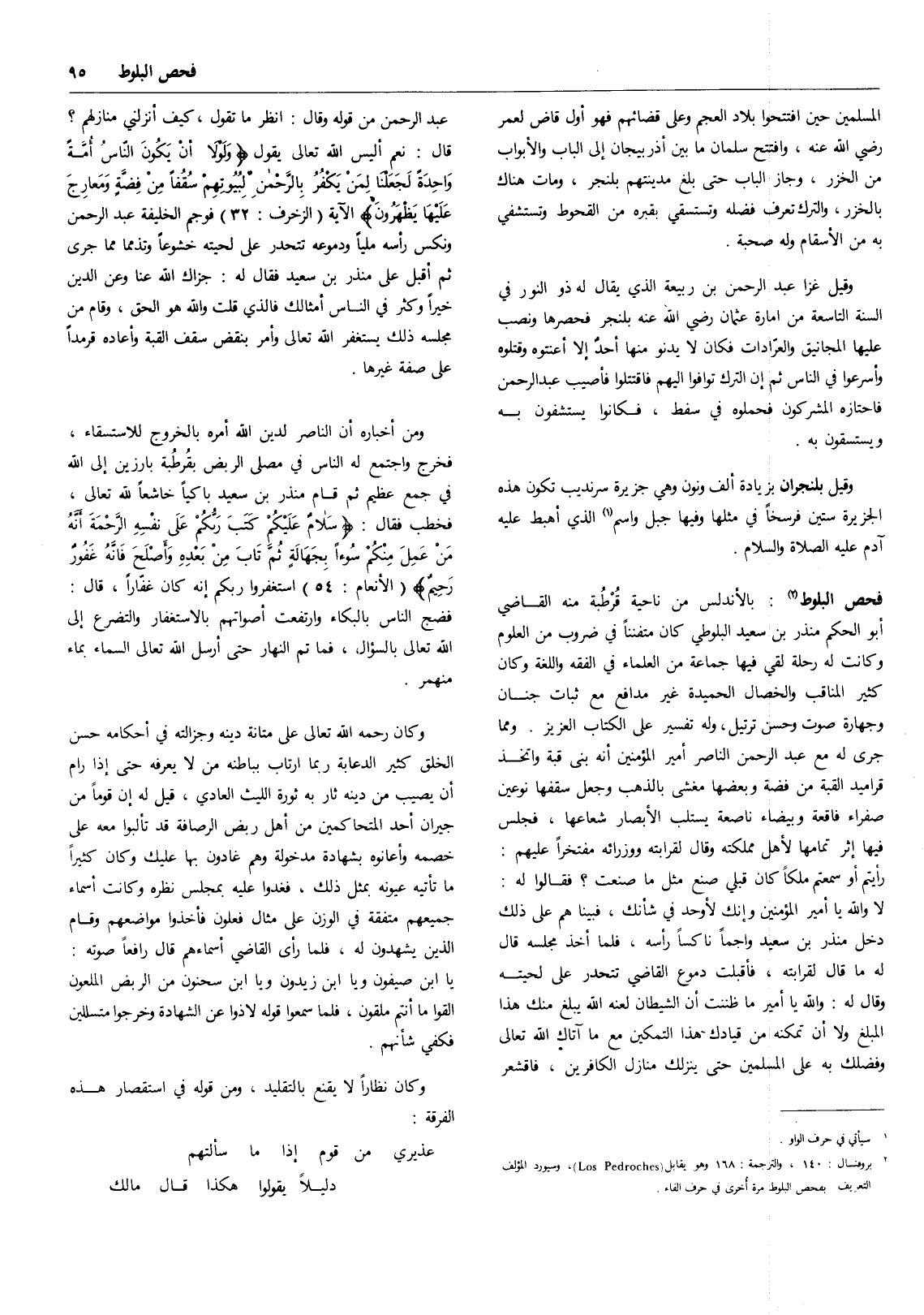 بالأندلس من ناحية قرطبة منه القاضي أبو الحكم منذر بن سعيد البلوطي كان متفنناً في ضروب من العلوم وكانت له رحلة لقي فيها جماعة من العلماء في الفقه واللغة وكان كثير المناقب والخصال الحميدة غير مدافع مع ثبات جنان وجهارة صوت وحسن ترتيل، وله تفسير على الكتاب العزيز. ومما جرى له مع عبد الرحمن الناصر أمير المؤمنين أنه بنى قبة واتخذ قراميد القبة من فضة وبعضها مغشى بالذهب وجعل سقفها نوعين صفراء فاقعة وبيضاء ناصعة يستلب الأبصار شعاعها، فجلس فيها إثر تمامها لأهل مملكته وقال لقرابته ووزرائه مفتخراً عليهم: رأيتم أو سمعتم ملكاً كان قبلي صنع مثل ما صنعت فقالوا له: لا والله يا أمير المؤمنين وإنك لأوحد في شأنك، فبينا هم على ذلك دخل منذر بن سعيد واجماً ناكساً رأسه، فلما أخذ مجلسه قال له ما قال لقرابته، فأقبلت دموع القاضي تتحدر على لحيته وقال له: والله يا أمير ما ظننت أن الشيطان لعنه الله يبلغ منك هذا المبلغ ولا أن تمكنه من قيادك هذا التمكين مع ما آتاك الله تعالى وفضلك به على المسلمين حتى ينزلك منازل الكافرين، فاقشعر
