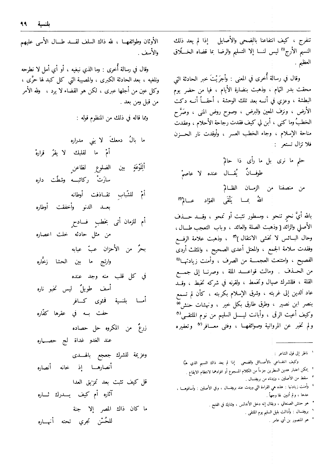 من منصفنا من الزمان الظالم ... (2) الله بما يلقى الفؤاد عالم بالله أي نحو تنحو، ومسطور تثبت أو تمحو، وقد حذف الأصلي والزائد وذهبت الصلة والعائد، وباب التعجب طال، وحال البائس لا تخشى الانتقال (3) ، وذهبت علامة الرفع وفقدت سلامة الجمع، والمعتل أعدى الصحيح، والمثلث أردى الفصيح، وامتنعت العجمة من الصرف، وأمنت زيادتها (4) من الحذف. ومالت قواعد الملة، وصرنا إلى جمع القلة، فللشرك صيال وتخمط، ولقرنه في شركه تخبط، وقد عاد الدين إلى غربته، وشرق الإسلام بكربته، كأن لم تسمع بنصر بن نصير، وطرق طارق بكل خير، ونهشات حنش (5) وكيف أعيت الرقى، وأبانت ليل السليم من نوم الملتقى (6) ولم تخبر عن المروانية وصوائفها، وفتى معافر (7) وتعفيره الأوثان وطوائفها، لله ذاك السلف لقد طال الأسى عليهم والأسف.