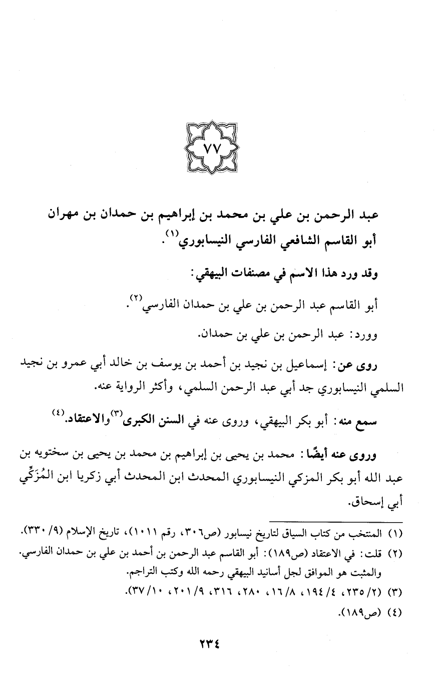 (77) عبد الرحمن بن علي بن محمَّد بن إبراهيم بن حمدان بن مهران أبو القاسم الشافعي الفارسي النيسابوري (¬1).