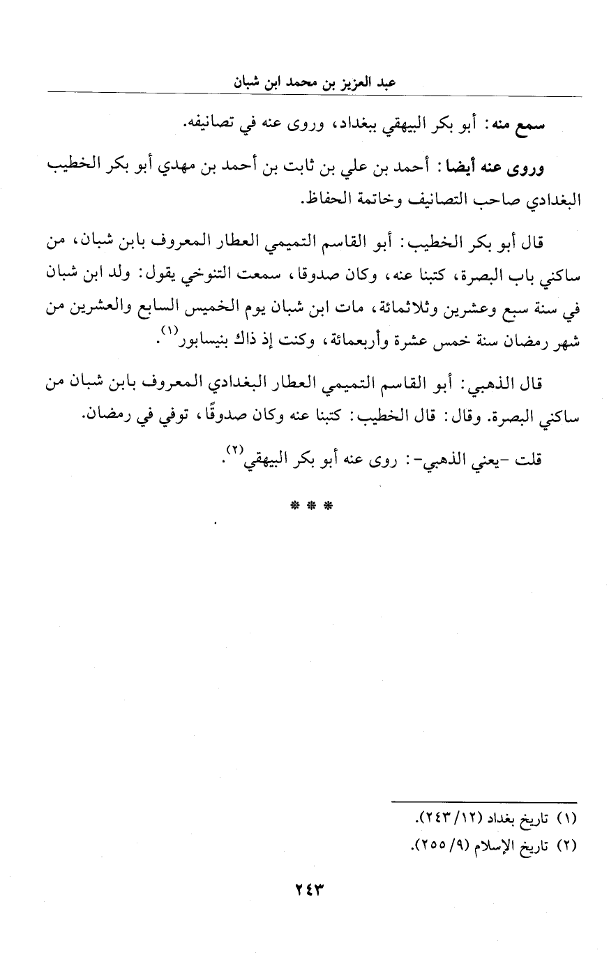 قال الذهبي: أبو القاسم التميمي العطار البغدادي المعروف بابن شبان من ساكني البصرة. وقال: قال الخطيب: كتبنا عنه وكان صدوقًا، توفي في رمضان.