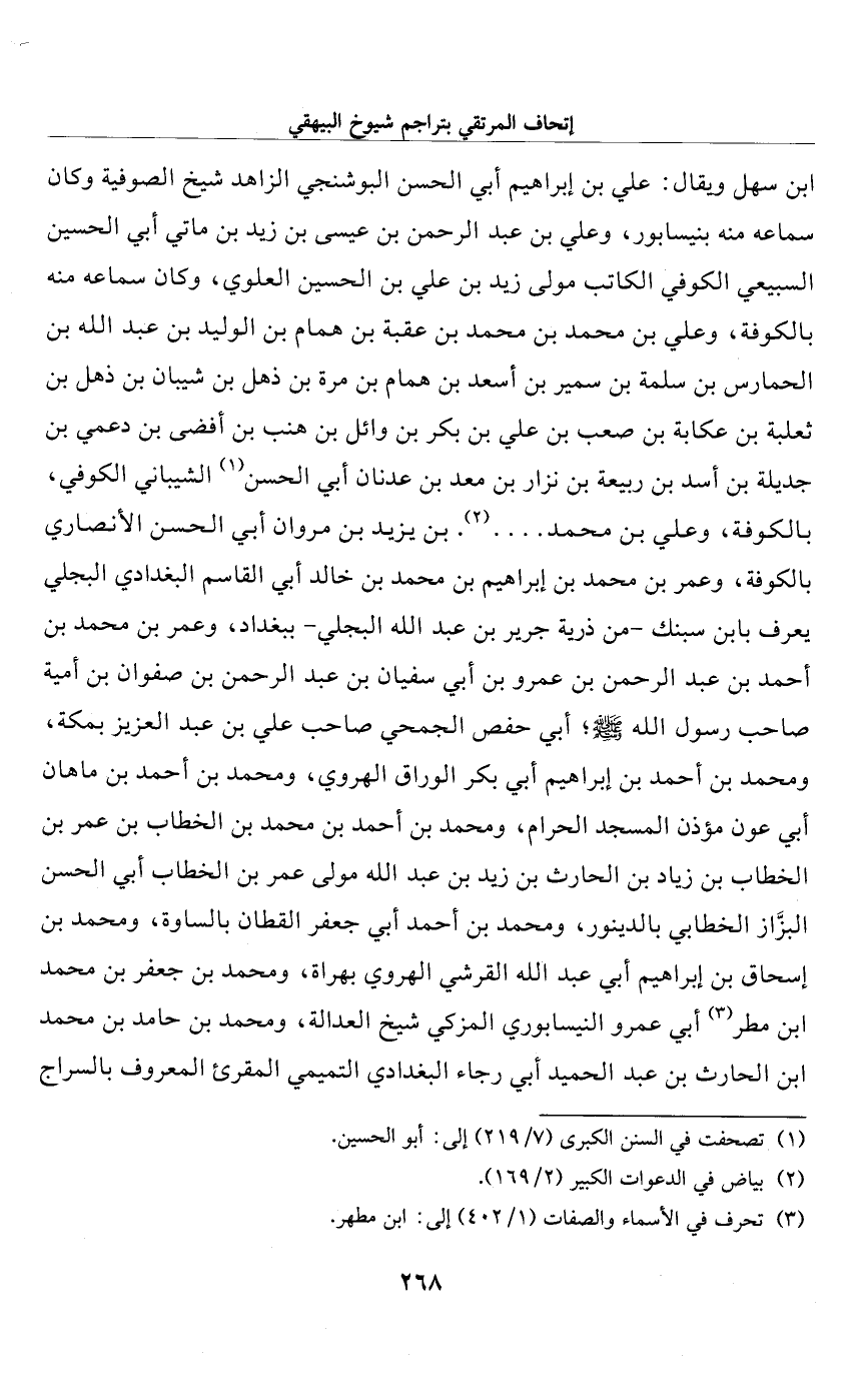 ابن سهل ويقال: علي بن إبراهيم أبي الحسن البوشنجي الزاهد شيخ الصوفية وكان سماعه منه بنيسابور، وعلي بن عبد الرحمن بن عيسى بن زيد بن ماتي أبي الحسين السبيعي الكوفي الكاتب مولى زيد بن علي بن الحسين العلوي، وكان سماعه منه بالكوفة، وعلي بن محمَّد بن محمَّد بن عقبة بن همام بن الوليد بن عبد الله بن الحمارس بن سلمة بن سمير بن أسعد بن همام بن مرة بن ذهل بن شيبان بن ذهل بن ثعلبة بن عكابة بن صعب بن علي بن بكر بن وائل بن هنب بن أفضى بن دعمي بن جديلة بن أسد بن ربيعة بن نزار بن معد بن عدنان أبي الحسن (¬1) الشيباني الكوفي، بالكوفة، وعلي بن محمَّد .... (¬2). بن يزيد بن مروان أبي الحسن الأنصاري بالكوفة، وعمر بن محمَّد بن إبراهيم بن محمَّد بن خالد أبي القاسم البغدادي البجلي يعرف بابن سبنك -من ذرية جرير بن عبد الله البجلي- ببغداد، وعمر بن محمَّد بن أحمد بن عبد الرحمن بن عمرو بن أبي سفيان بن عبد الرحمن بن صفوان بن أمية صاحب رسول الله - صلى الله عليه وسلم -؛ أبي حفص الجمحي صاحب علي بن عبد العزيز بمكة، ومحمَّد بن أحمد بن إبراهيم أبي بكر الوراق الهروي، ومحمَّد بن أحمد بن ماهان أبي عون مؤذن المسجد الحرام، ومحمَّد بن أحمد بن محمَّد بن الخطاب بن عمر بن الخطاب بن زياد بن الحارث بن زيد بن عبد الله مولى عمر بن الخطاب أبي الحسن البزَّاز الخطابي بالدينور، ومحمَّد بن أحمد أبي جعفر القطان بالساوة، ومحمَّد بن إسحاق بن إبراهيم أبي عبد الله القرشي الهروي بهراة، ومحمَّد بن جعفر بن محمَّد ابن مطر (¬3) أبي عمرو النيسابوري المزكي شيخ العدالة، ومحمَّد بن حامد بن محمَّد ابن الحارث بن عبد الحميد أبي رجاء البغدادي التميمي المقرئ المعروف بالسراج