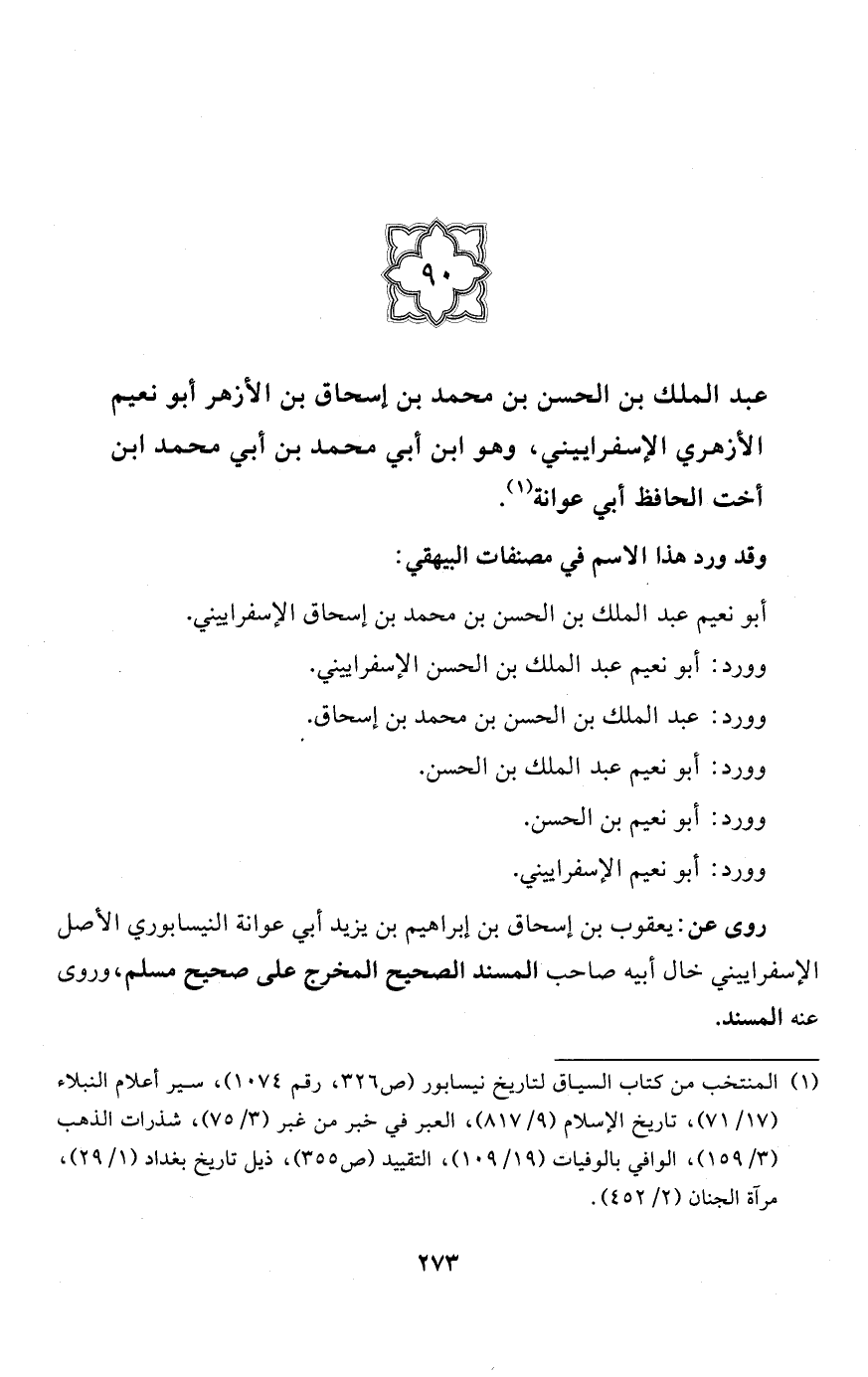 (90) عبد الملك بن الحسن بن محمَّد بن إسحاق بن الأزهر أبو نعيم الأزهري الإسفراييني، وهو ابن أبي محمَّد بن أبي محمَّد ابن أخت الحافظ أبي عوانة (¬1).
