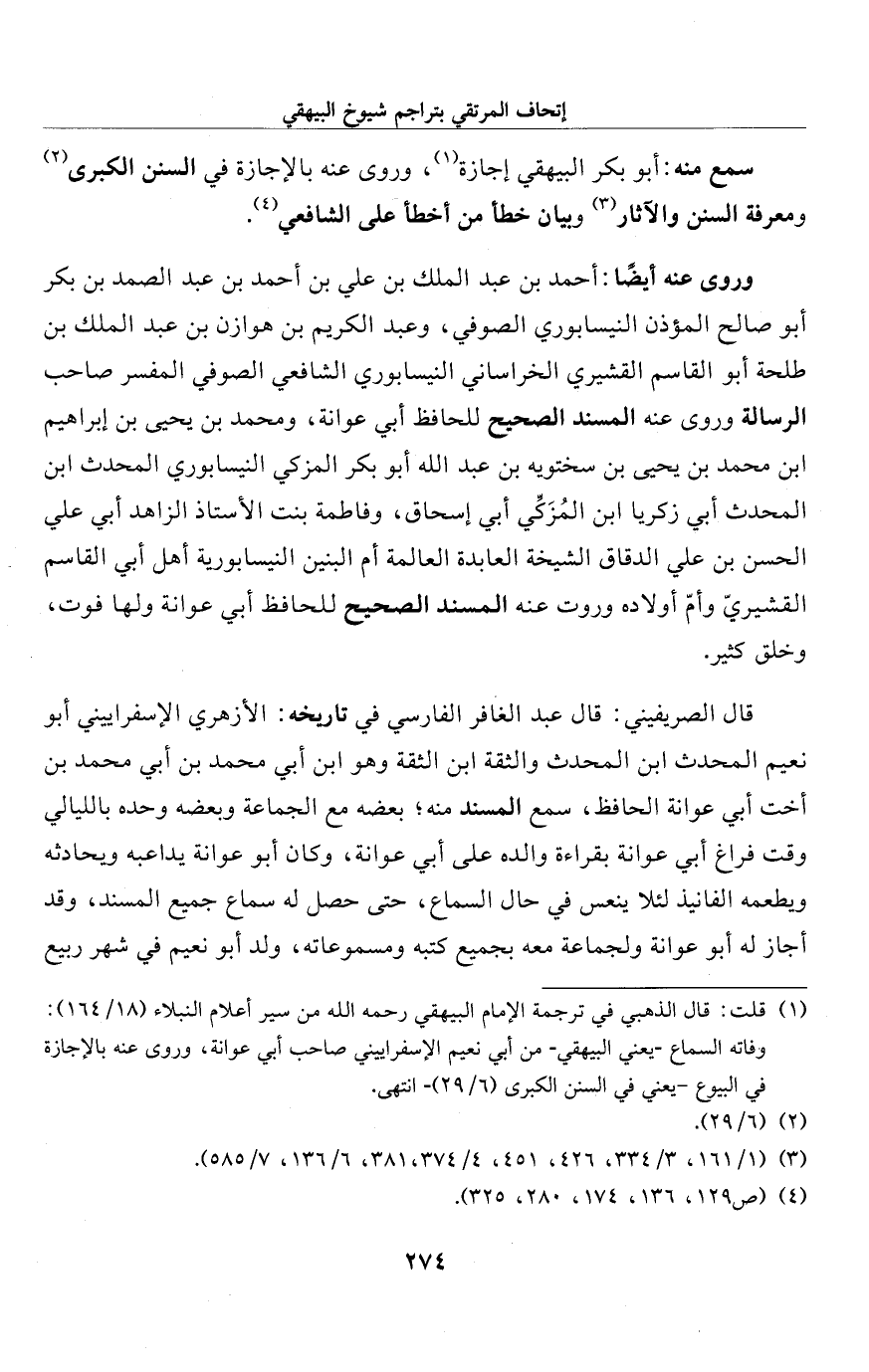 (¬1) قلت: قال الذهبي في ترجمة الإِمام البيهقي رحمه الله من سير أعلام النبلاء (18/ 164): وفاته السماع -يعني البيهقي- من أبي نعيم الإسفراييني صاحب أبي عوانة، وروى عنه بالإجازة في البيوع -يعني في السنن الكبرى (6/ 29) - انتهى.