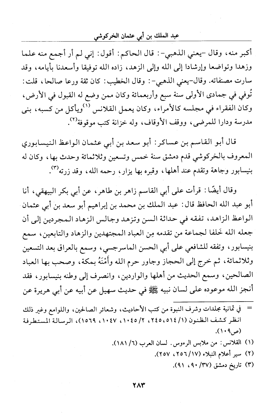قال أبو القاسم بن عساكر: أبو سعد بن أبي عثمان الواعظ النيسابوري المعروف بالخركوشي قدم دمشق سنة خمس وتسعين وثلاثمائة وحدث بها، وكان له بنيسابور وجاهة وتقدم عند أهلها، وقبره بها يزار، رحمه الله، وقد زرته (¬3).