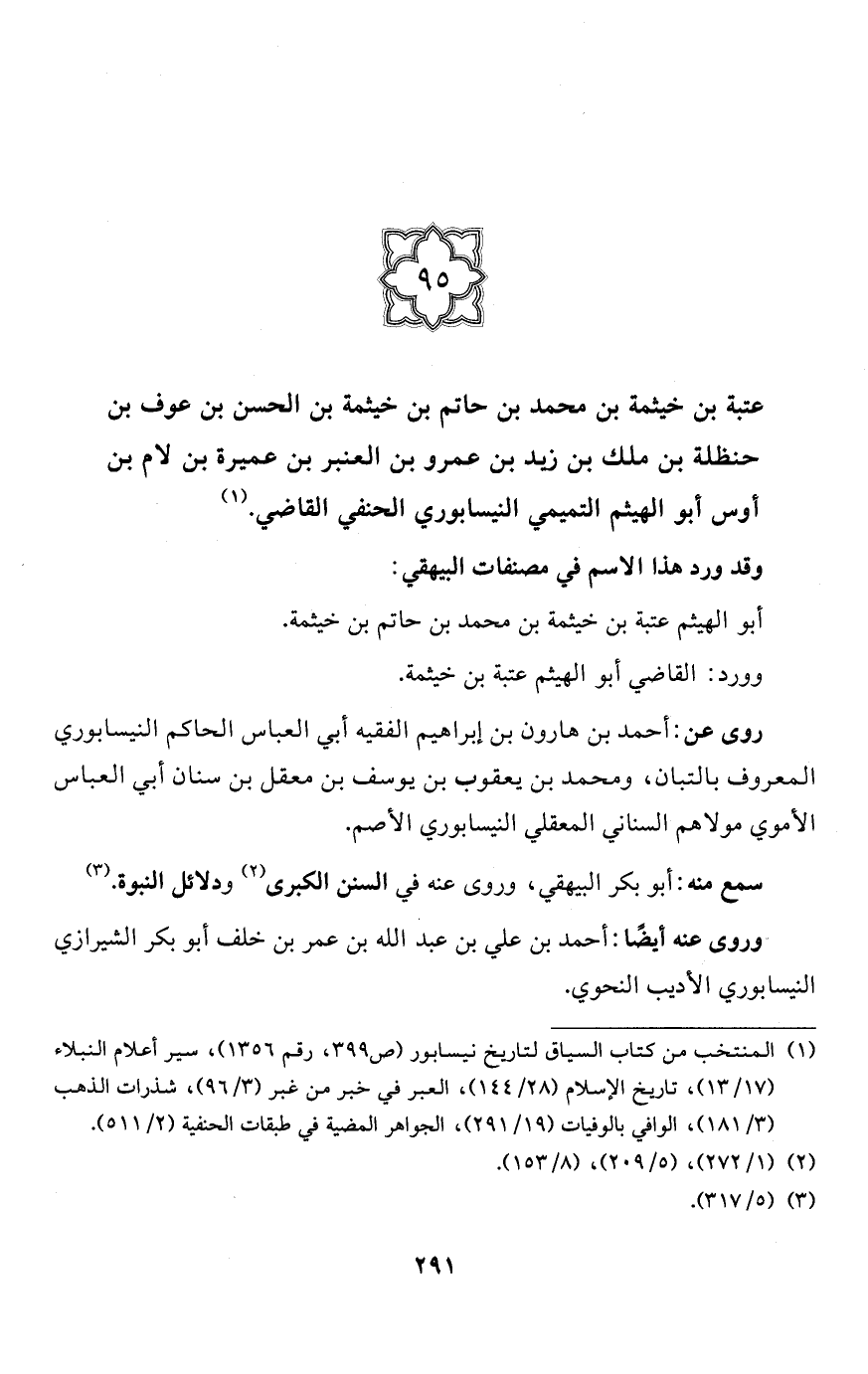 (95) عتبة بن خيثمة بن محمَّد بن حاتم بن خيثمة بن الحسن بن عوف بن حنظلة بن ملك بن زيد بن عمرو بن العنبر بن عميرة بن لام بن أوس أبو الهيثم التميمي النيسابوري الحنفي القاضي. (¬1)