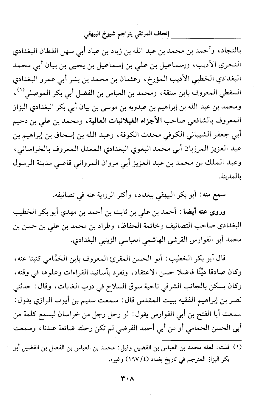 بالنجاد، وأحمدُ بن محمَّد بن عبد الله بن زياد بن عباد أبي سهل القطان البغدادي النحوي الأديب، وإسماعيل بن علي بن إسماعيل بن يحيى بن بيان أبي محمَّد البغدادي الخطبي الأديب المؤرخ، وعثمان بن محمَّد بن بشر أبي عمرو البغدادي السقطي المعروف بابن سنقة، ومحمَّد بن العباس بن الفضل أبي بكر الموصلي (¬1)، ومحمَّد بن عبد الله بن إبراهيم بن عبدويه بن موسى بن بيان أبي بكر البغدادي البزاز المعروف بالشافعي صاحب الأجزاء الغيلانيات العالية، ومحمَّد بن علي بن دحيم أبي جعفر الشيباني الكوفي محدث الكوفة، وعبد الله بن إسحاق بن إبراهيم بن عبد العزيز المرزبان أبي محمَّد البغوي البغدادي المعدل المعروف بالخراساني، وعبد الملك بن محمَّد بن عبد العزيز أبي مروان المرواني قاضي مدينة الرسول بالمدينة.