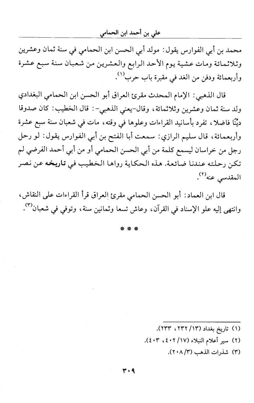 قال الذهبي: الإِمام المحدث مقرئ العراق أبو الحسن ابن الحمامي البغدادي ولد سنة ثمان وعشرين وثلاثمائة، وقال -يعني الذهبي-: قال الخطيب: كان صدوقا ديِّنًا فاضلا، تفرد بأسانيد القراءات وعلوها في وقته، مات في شعبان سنة سبع عشرة وأربعمائة، قال سليم الرازي: سمعت أبا الفتح بن أبي الفوارس يقول: لو رحل رجل من خراسان ليسمع كلمة من أبي الحسن الحمامي أو من أبي أحمد الفرضي لم تكن رحلته عندنا ضائعة. هذه الحكاية رواها الخطيب في تاريخه عن نصر المقدسي عنه (¬2).