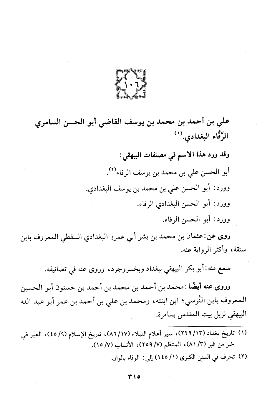 (106) علي بن أحمد بن محمَّد بن يوسف القاضي أبو الحسن السامري الرَّفَّاء البغدادي. (¬1)