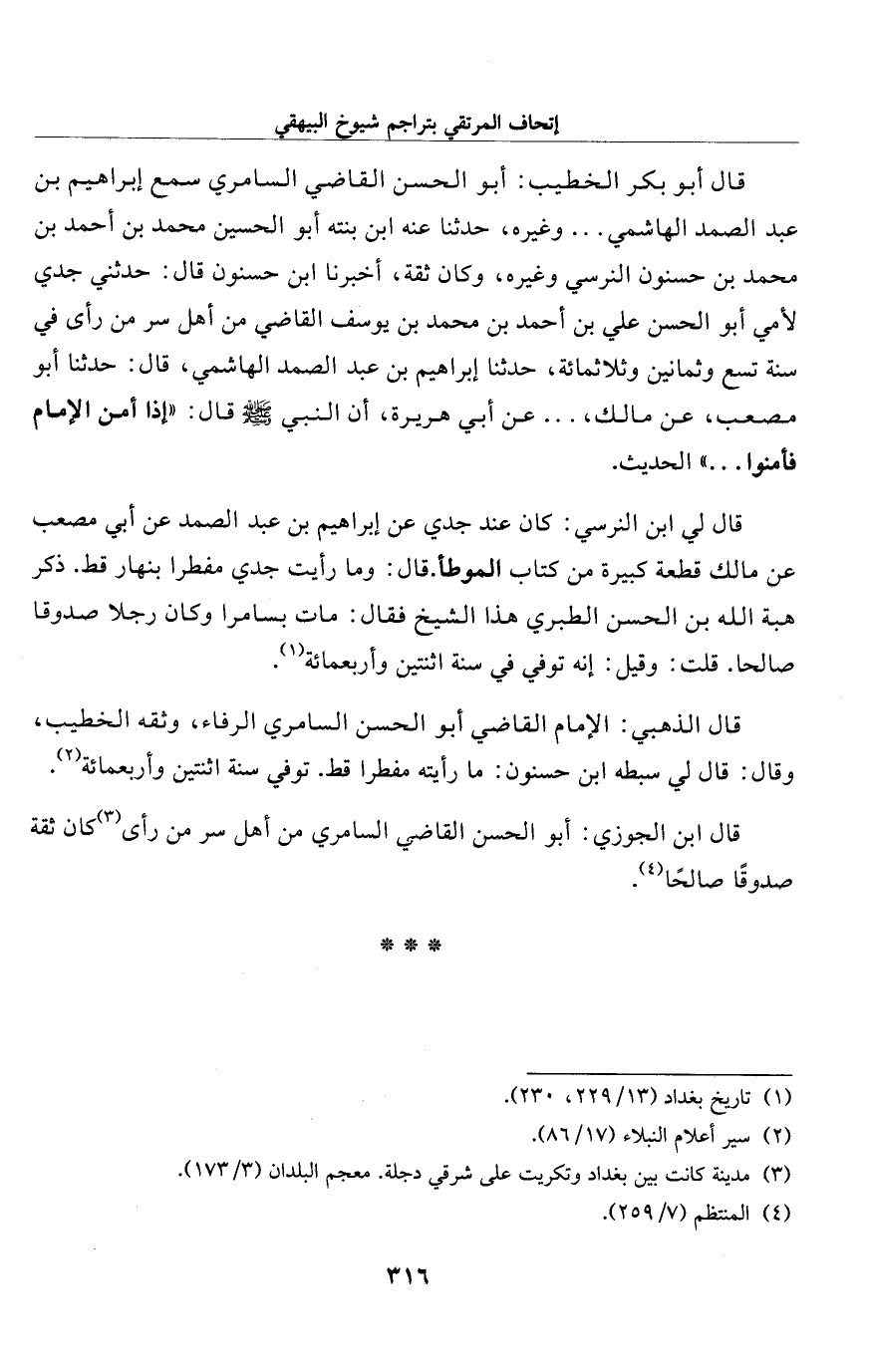 قال أبو بكر الخطيب: أبو الحسن القاضي السامري سمع إبراهيم بن عبد الصمد الهاشمي ... وغيره، حدثنا عنه ابن بنته أبو الحسين محمَّد بن أحمد بن محمَّد بن حسنون النرسي وغيره، وكان ثقة، أخبرنا ابن حسنون قال: حدثني جدي لأمي أبو الحسن علي بن أحمد بن محمَّد بن يوسف القاضي من أهل سر من رأى في سنة تسع وثمانين وثلاثمائة، حدثنا إبراهيم بن عبد الصمد الهاشمي، قال: حدثنا أبو مصعب، عن مالك، ... عن أبي هريرة، أن النبي - صلى الله عليه وسلم - قال: "إذا أمن الإمام فأمنوا ... " الحديث.