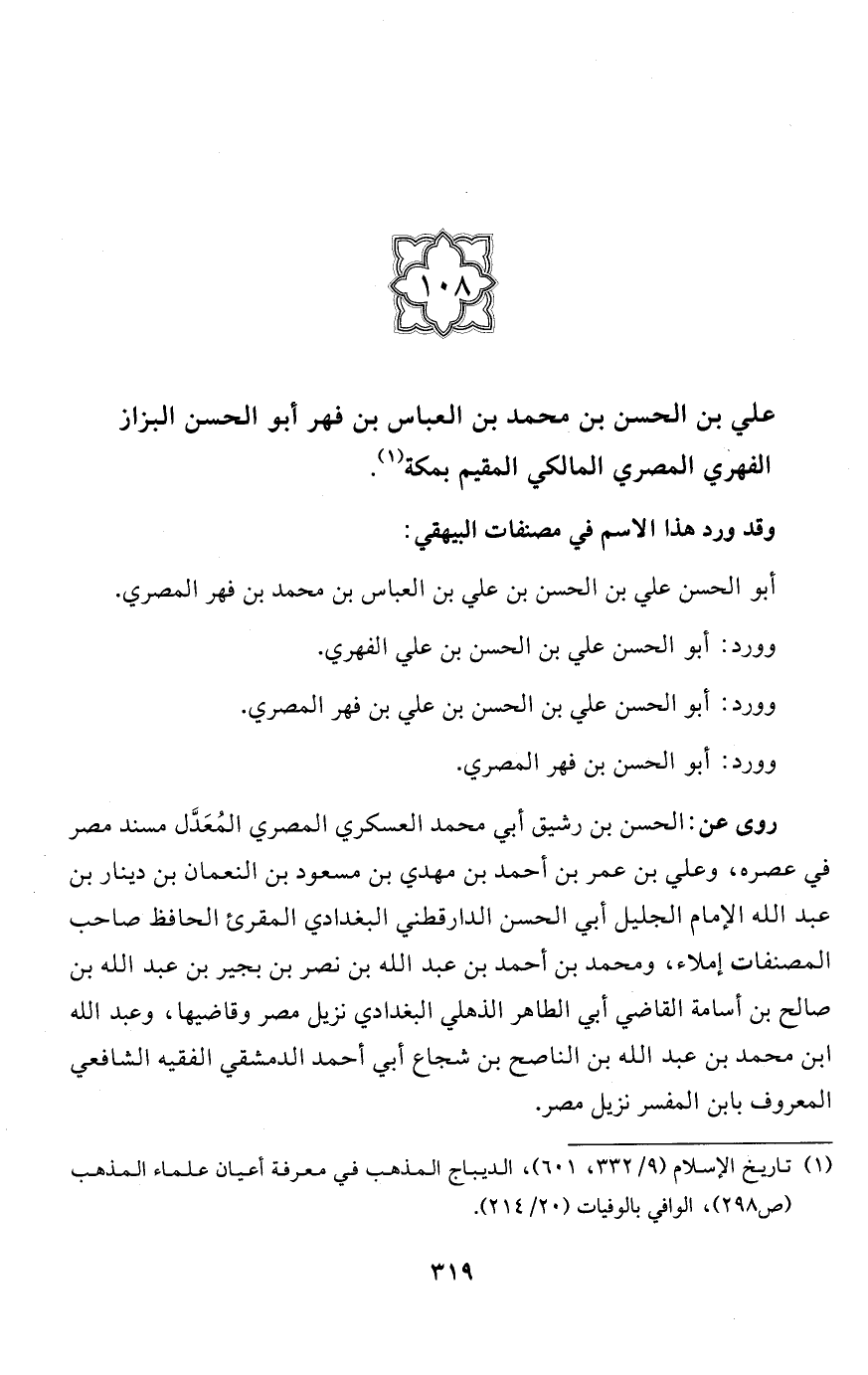 (108) علي بن الحسن بن محمَّد بن العباس بن فهو أبو الحسن البزاز الفهري المصري المالكي المقيم بمكة (¬1).