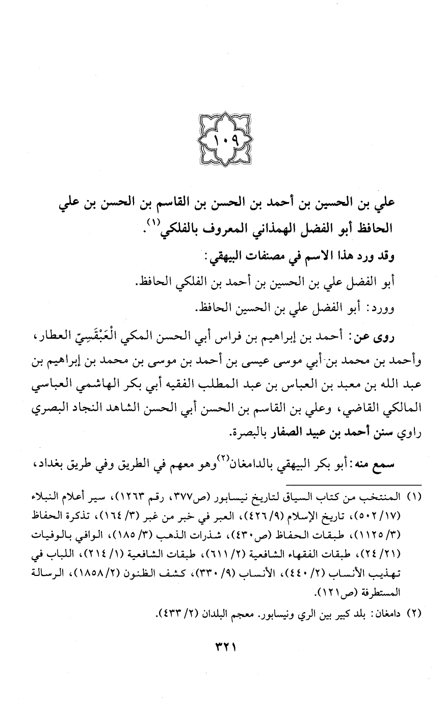 (109) علي بن الحسين بن أحمد بن الحسن بن القاسم بن الحسن بن علي الحافظ أبو الفضل الهمذاني المعروف بالفلكي (¬1).