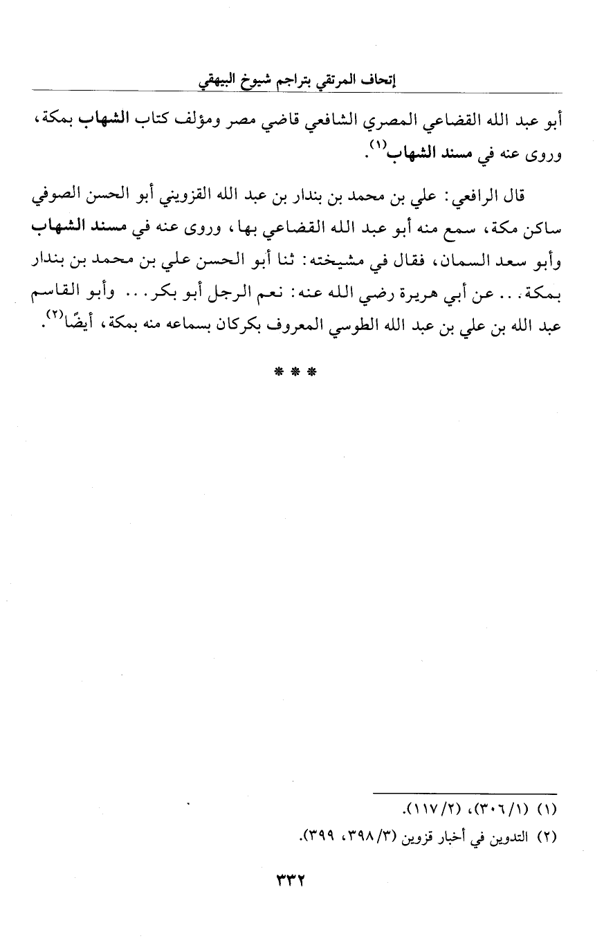 قال الرافعي: علي بن محمَّد بن بندار بن عبد الله القزويني أبو الحسن الصوفي ساكن مكة، سمع منه أبو عبد الله القضاعي بها، وروى عنه في مسند الشهاب وأبو سعد السمان، فقال في مشيخته: ثنا أبو الحسن علي بن محمَّد بن بندار بمكة ... عن أبي هريرة رضي الله عنه: نعم الرجل أبو بكر ... وأبو القاسم عبد الله بن علي بن عبد الله الطوسي المعروف بكركان بسماعه منه بمكة، أيضًا (¬2).