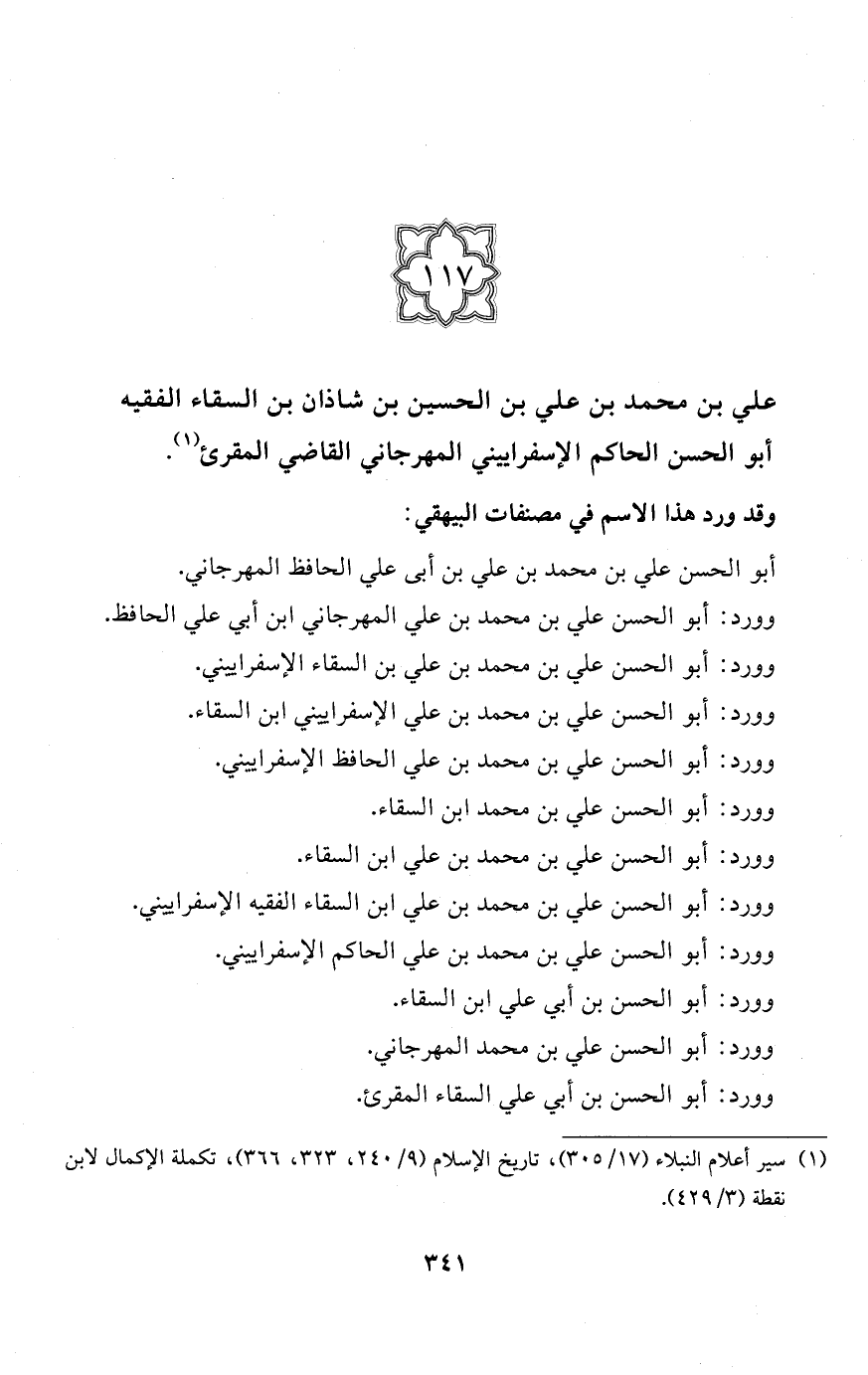 (117) علي بن محمَّد بن علي بن الحسين بن شاذان بن السقاء الفقيه أبو الحسن الحاكم الإسفراييني المهرجاني القاضي المقرئ (¬1).