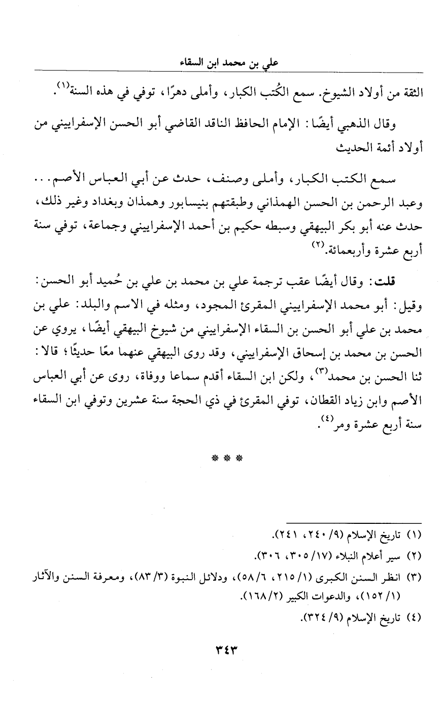 قلت: وقال أيضًا عقب ترجمة علي بن محمَّد بن علي بن حُميد أبو الحسن: وقيل: أبو محمَّد الإسفراييني المقرئ المجود، ومثله في الاسم والبلد: علي بن محمَّد بن علي أبو الحسن بن السقاء الإسفراييني من شيوخ البيهقي أيضًا، يروي عن الحسن بن محمَّد بن إسحاق الإسفراييني، وقد روى البيهقي عنهما معًا حديثًا؛ قالا: ثنا الحسن بن محمَّد (¬3)، ولكن ابن السقاء أقدم سماعا ووفاة، روى عن أبي العباس الأصم وابن زياد القطان، توفي المقرئ في ذي الحجة سنة عشرين وتوفي ابن السقاء سنة أربع عشرة ومر (¬4).
