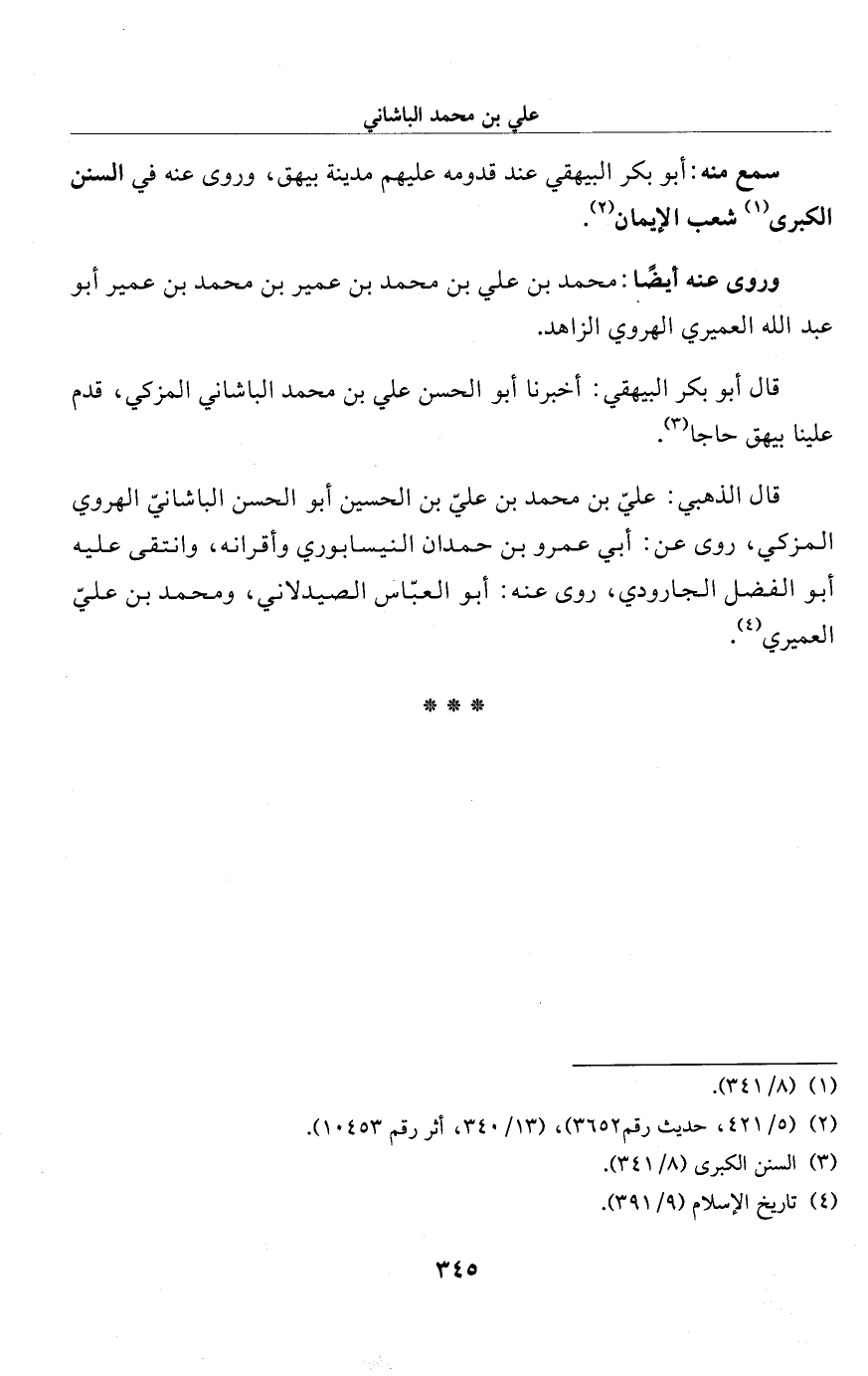 قال الذهبي: عليّ بن محمَّد بن عليّ بن الحسين أبو الحسن الباشانيّ الهروي المزكي، روى عن: أبي عمرو بن حمدان النيسابوري وأقرانه، وانتقى عليه أبو الفضل الجارودي، روى عنه: أبو العبّاس الصيدلاني، ومحمَّد بن عليّ العميري (¬4).