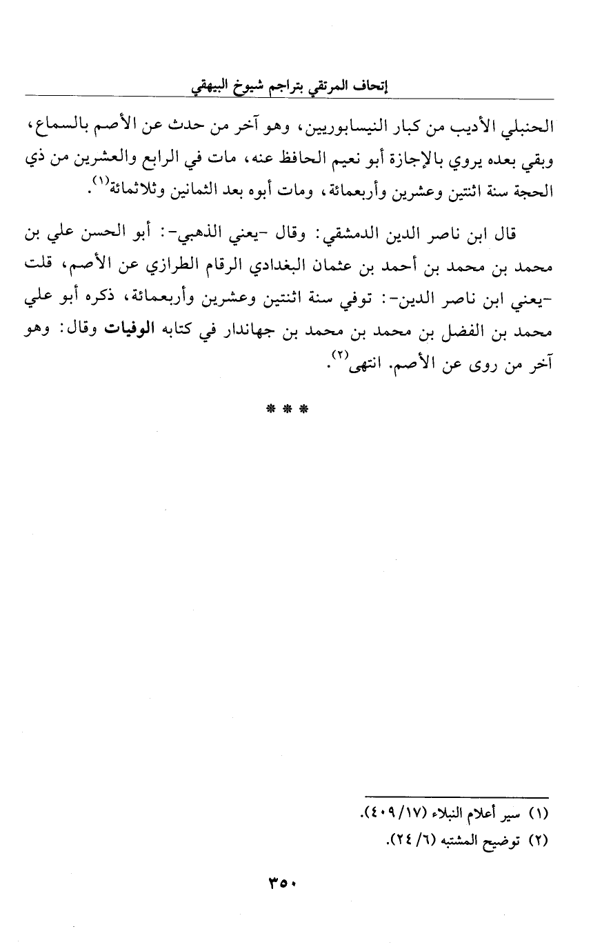 قال ابن ناصر الدين الدمشقي: وقال -يعني الذهبي-: أبو الحسن علي بن محمَّد بن محمَّد بن أحمد بن عثمان البغدادي الرقام الطرازي عن الأصم، قلت -يعني ابن ناصر الدين-: توفي سنة اثنتين وعشرين وأربعمائة، ذكره أبو علي محمَّد بن الفضل بن محمَّد بن محمَّد بن جهاندار في كتابه الوفيات وقال: وهو آخر من روى عن الأصم. انتهى (¬2).