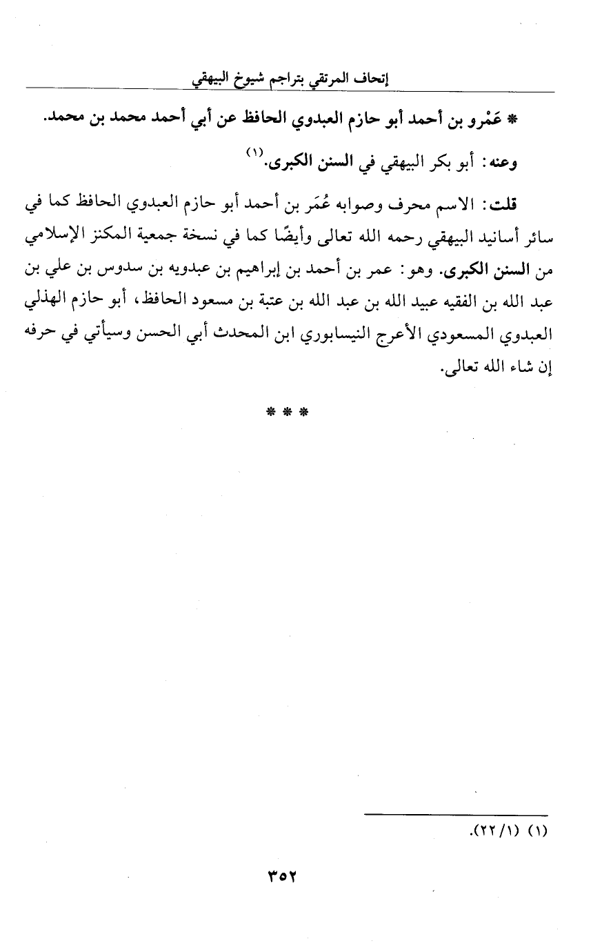 قلت: الاسم محرف وصوابه عُمَر بن أحمد أبو حازم العبدوي الحافظ كما في سائر أسانيد البيهقي رحمه الله تعالى وأيضًا كما في نسخة جمعية المكنز الإِسلامي من السنن الكبرى. وهو: عمر بن أحمد بن إبراهيم بن عبدويه بن سدوس بن علي بن عبد الله بن الفقيه عبيد الله بن عبد الله بن عتبة بن مسعود الحافظ، أبو حازم الهذلي العبدوي المسعودي الأعرج النيسابوري ابن المحدث أبي الحسن وسيأتي في حرفه إن شاء الله تعالى.