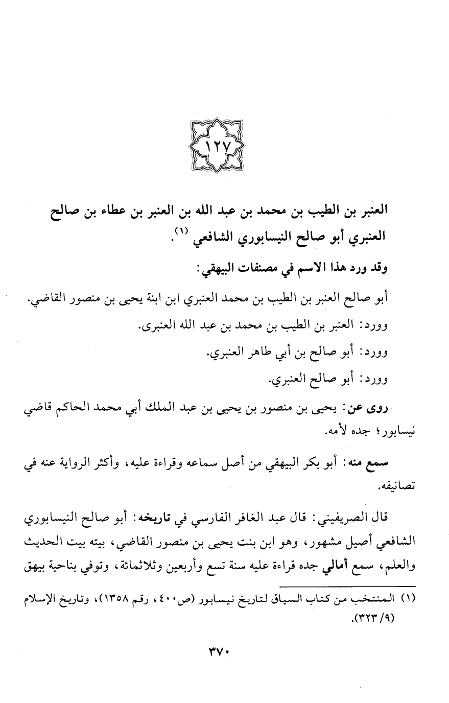 (127) العنبر بن الطيب بن محمَّد بن عبد الله بن العنبر بن عطاء بن صالح العنبري أبو صالح النيسابوري الشافعي (¬1).