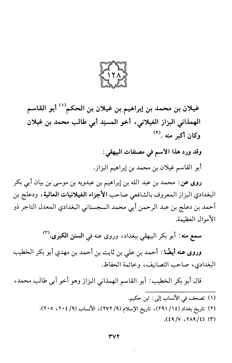 (128) غيلان بن محمَّد بن إبراهيم بن غيلان بن الحكم (¬1) أبو القاسم الهمذاني البزاز الغيلاني، أخو المسنِد أبي طالب محمَّد بن غيلان وكان أكبر منه. (¬2)