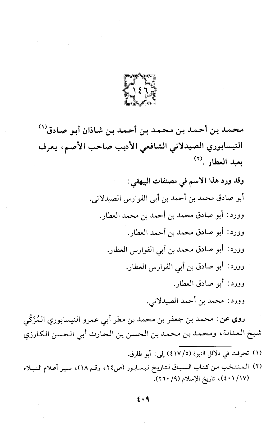 (146) محمَّد بن أحمد بن محمَّد بن أحمد بن شاذان أبو صادق (¬1) النيسابوري الصيدلاني الشافعي الأديب صاحب الأصم، يعرف بعبد العطار. (¬2)