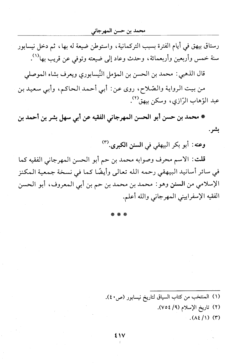 * محمَّد بن حسن أبو الحسن المهرجاني الفقيه عن أبي سهل بشر بن أحمد بن بشر.